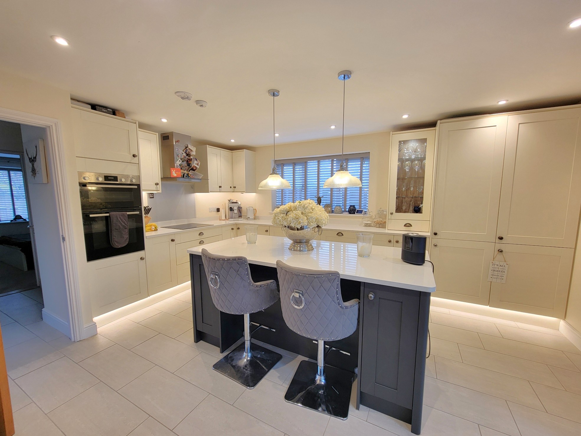 Kitchen area: Fitted with an extensive range of good quality shaker style kitchen units having panelled doors and drawer fronts, glazed display cupboards, solid quartz worktops inset with one and a half bowl stainless steel sink unit with mono mixer tap, good range of built-in appliances include Bosch eye level double oven and grill, inset black glass ceramic hob, stainless steel extractor connected over, dishwasher, large generous upright fridge and separate upright freezer, contrasting island with wide pan drawers, storage cupboards and quartz worktop, inset spotlights, stone effect floor tiling to the kitchen/dining area with underfloor heating, PVC double glazed window to the side aspect.