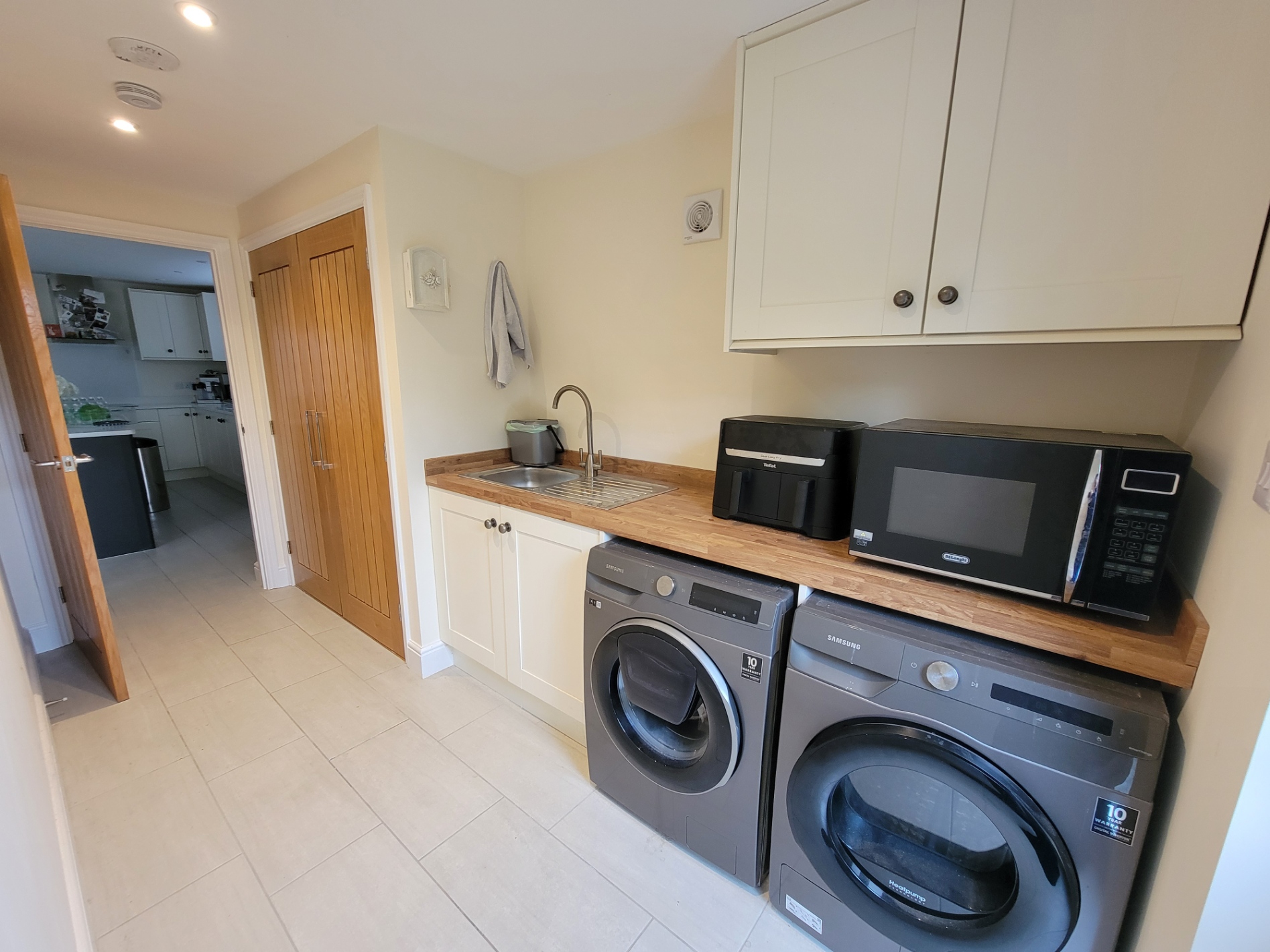 Utility room: 12' 7" x 6' 2" (3.84m x 1.88m) Fitted with a good range of base and wall mounted unit having shaker style doors, thick wood effect worktops inset with stainless steel sink unit with mixer tap, space for both washing machine and tumble dryer, extractor fan, built-in double cupboard with solid oak doors housing the air source central heating system, stone effect tiled flooring with underfloor heating, PVC double glazed door opening to the rear garden.