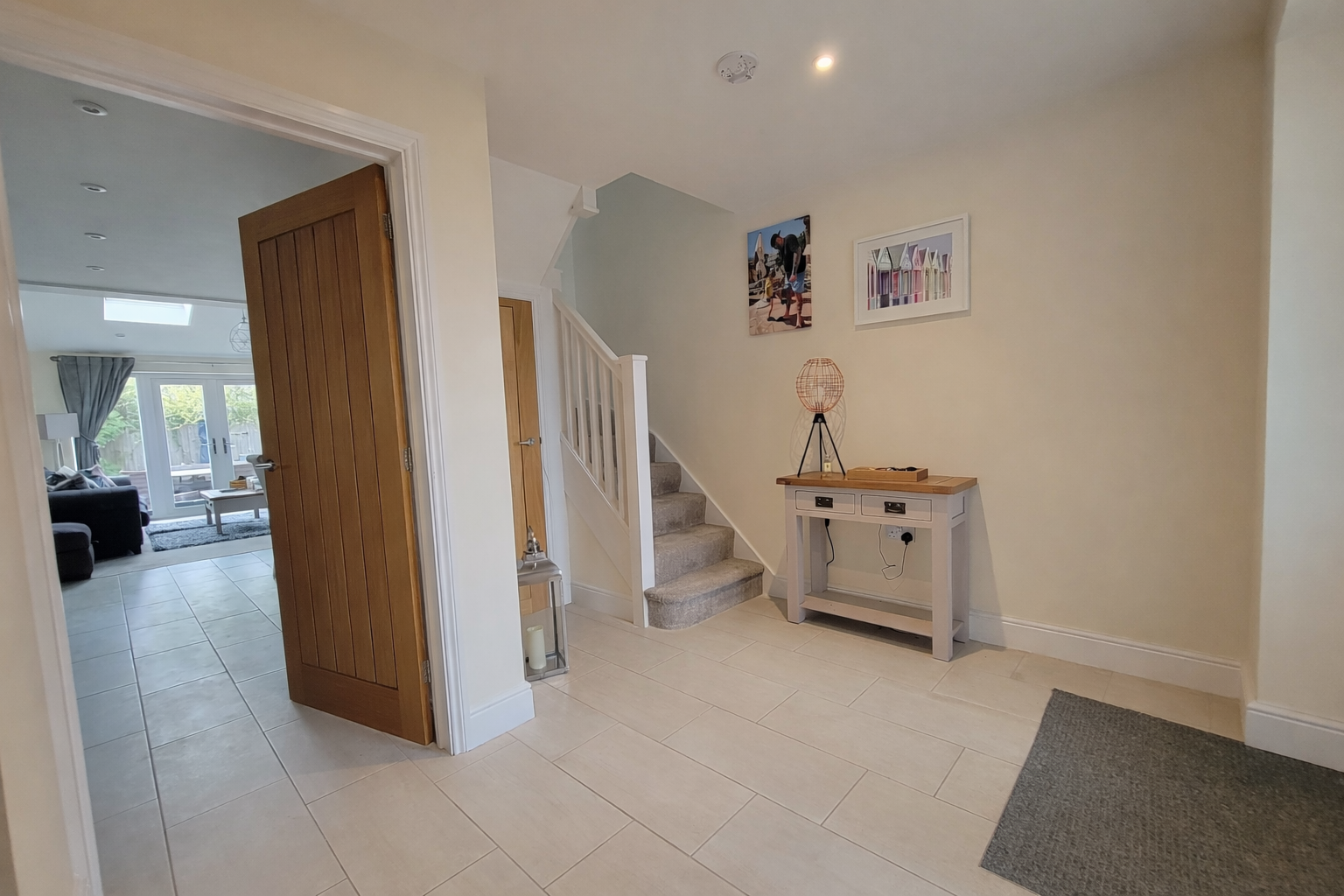 Reception hall: 11' 3" x 9' 9" (3.43m x 2.97m) Solid oak doors, staircase to the first floor, built-in deep understairs storage cupboard, mains smoke alarm, stone effect tiled floor with underfloor heating.