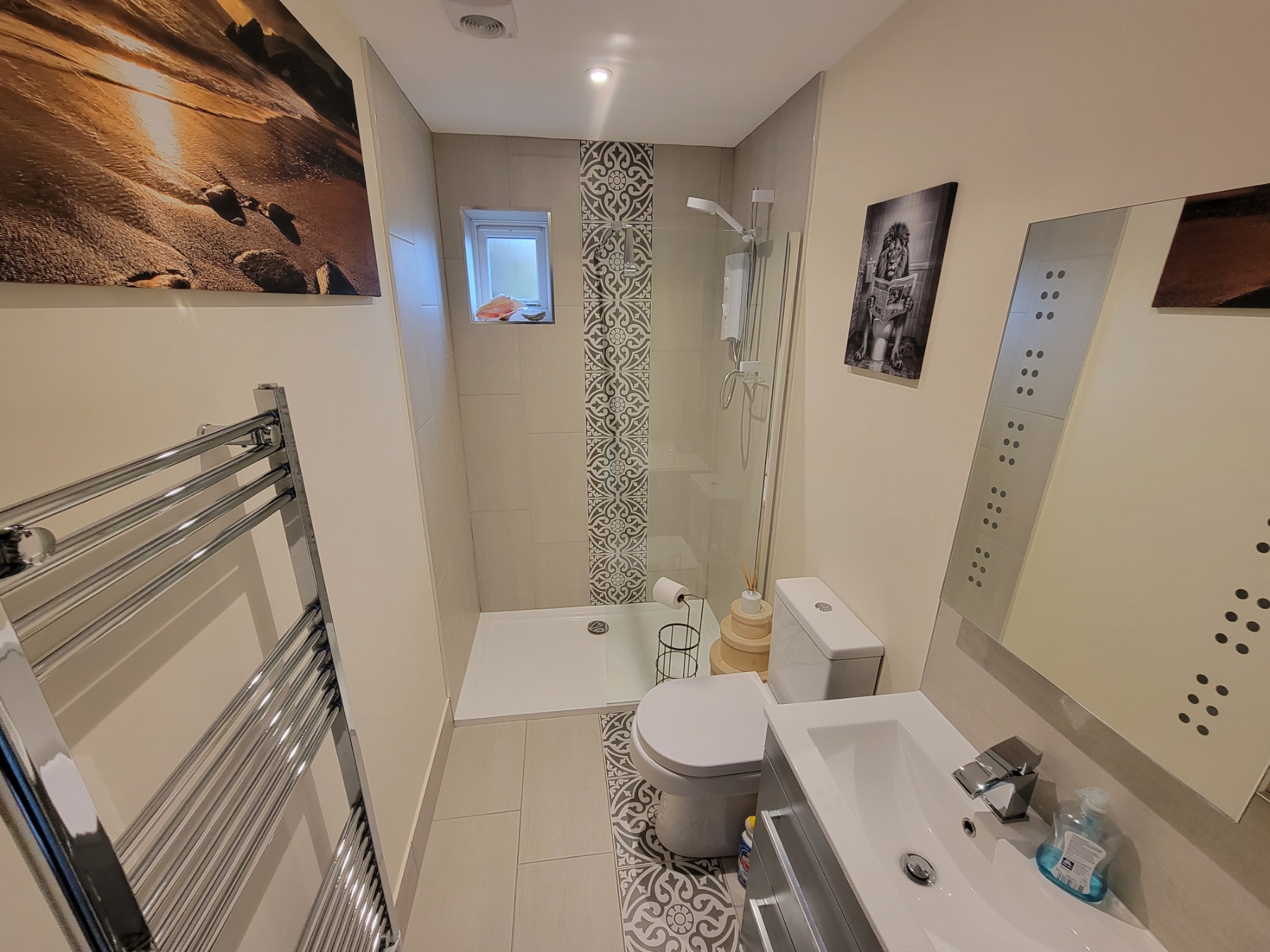 Ground floor shower room: 8' 4" x 5' 0" (2.54m x 1.52m) Walk-in shower enclosure with glazed screen low level wc and vanity unit with ceramic sink, mono mixer tap and storage drawers below, inset spotlights, extractor fan, mirror with integrated light and plug, extensive wall and floor tiling with decorative feature, underfloor heating, PVC double glazed window to the side aspect.
