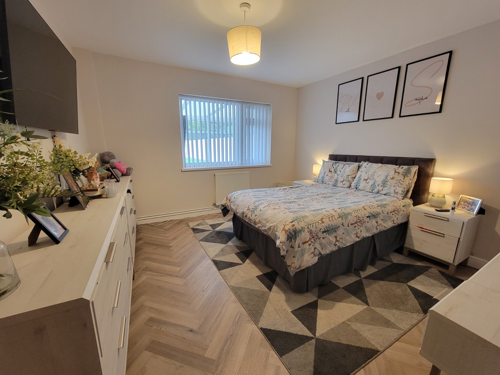 Radiator, space for wardrobes, attractive Karndean style herringbone wood effect flooring, high level tv point, generous PVC double glazed window to the rear aspect overlooking the garden.
