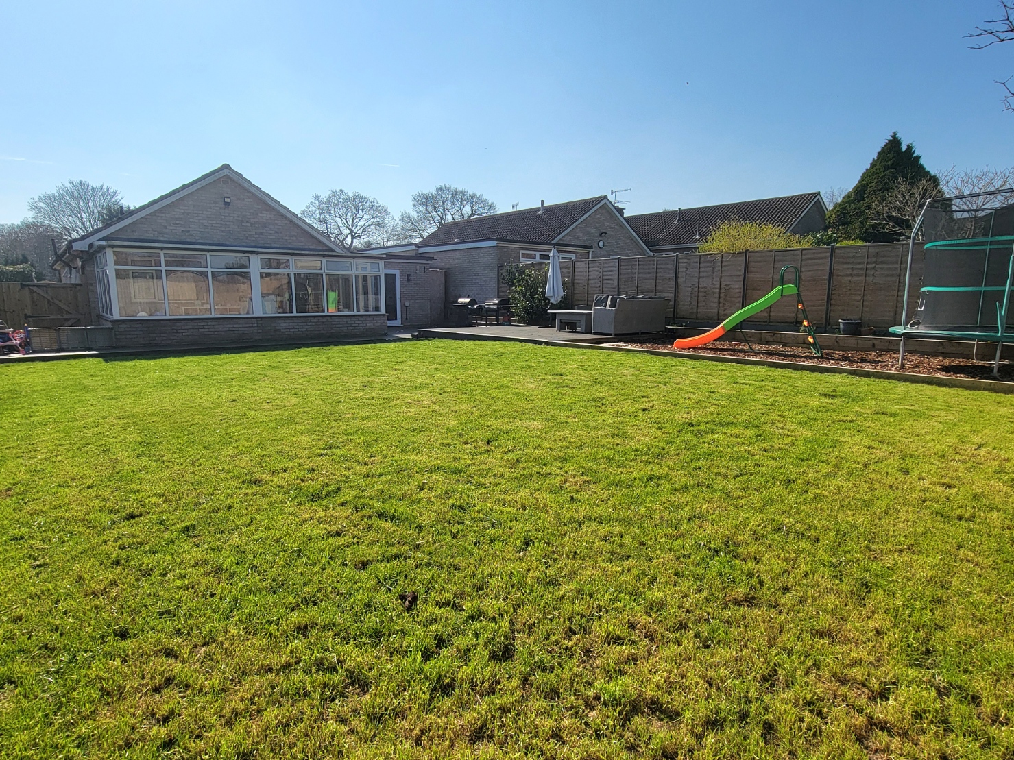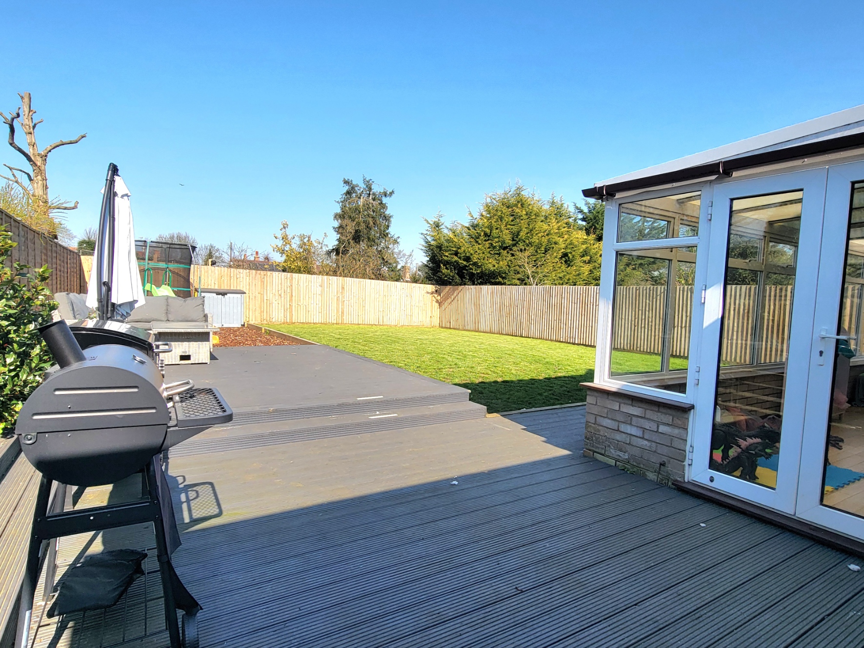 To the front there is a large open plan lawn with an adjacent drive providing parking for numerous vehicles including perhaps caravan or motorhome. Gated access to the side leads to the large rear garden, landscaped with split level decking areas, alfresco dining and BBQ area, raised bed with bark chipping play area leading to the extensive lawn with newly fenced boundaries. The garden faces south/westerly and offer a good degree of seclusion.