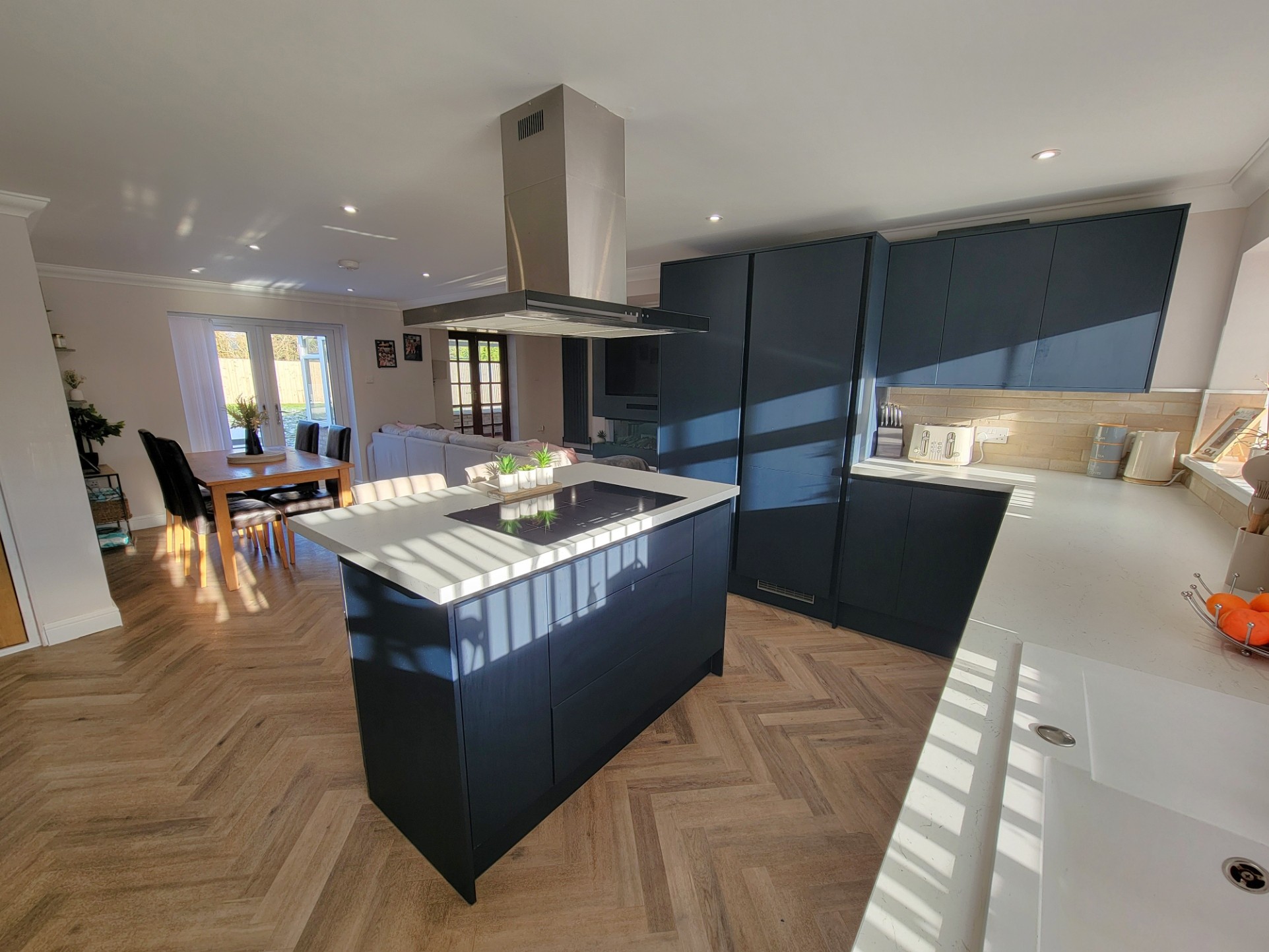 The kitchen is fitted with an extensive range of contemporary styled base and wall mounted units, attractive white quartz worktops inset composite sink unit with mono mixer tap, built-in appliances include full size fridge, separate full size freezer, double black glass and stainless steel fan assisted ovens, stainless steel microwave above, further stainless steel and glass oven and grill, integrated dishwasher, freestanding island inset with black glass five ring hob, contemporary style stainless steel extractor fan connected over, metro tiled splash backs, inset spotlights, two full height contemporary styled radiators, separate built-in store room, glazed double doors open to the conservatory, two generous PVC double glazed window overlooking the front garden.