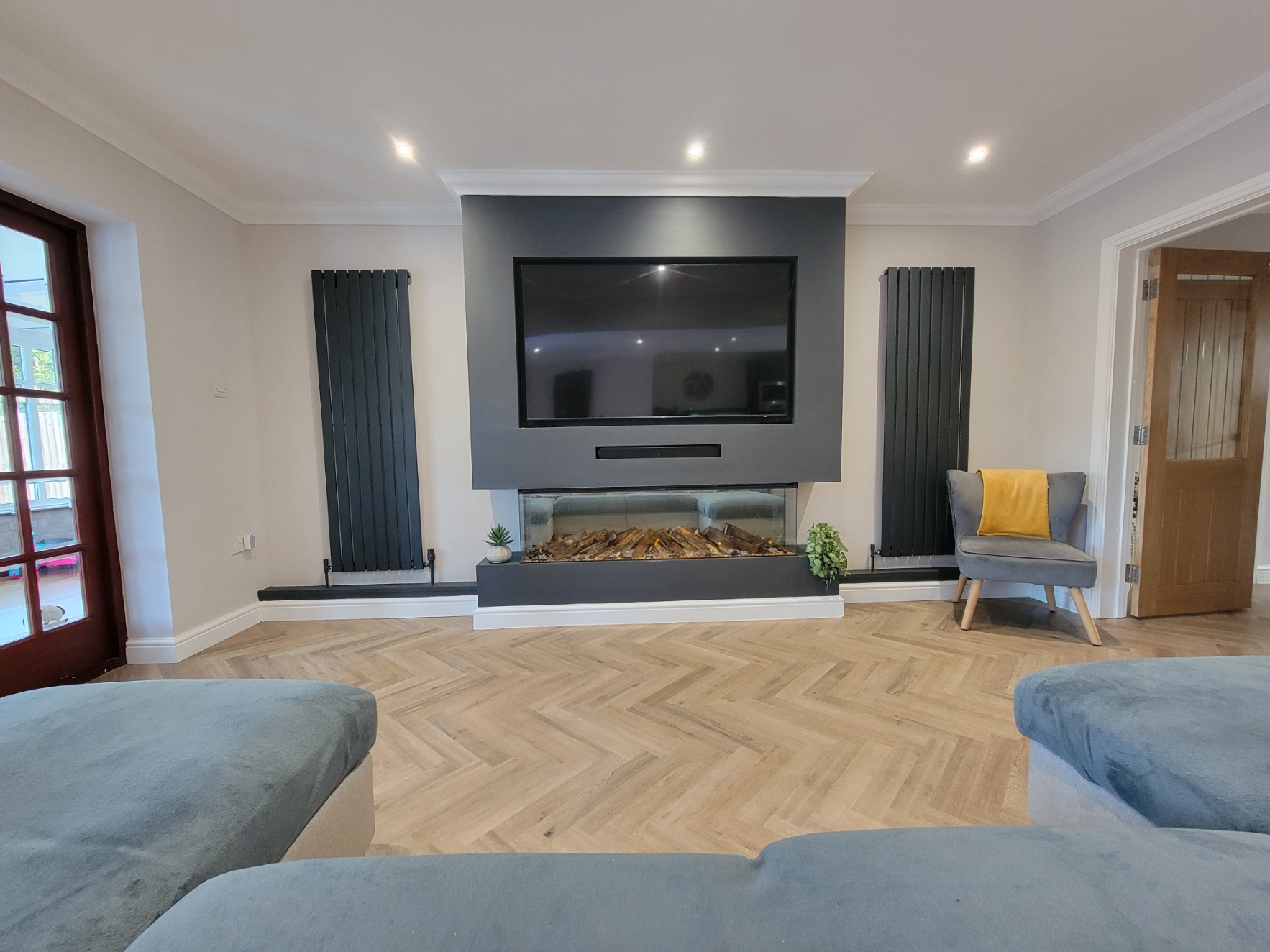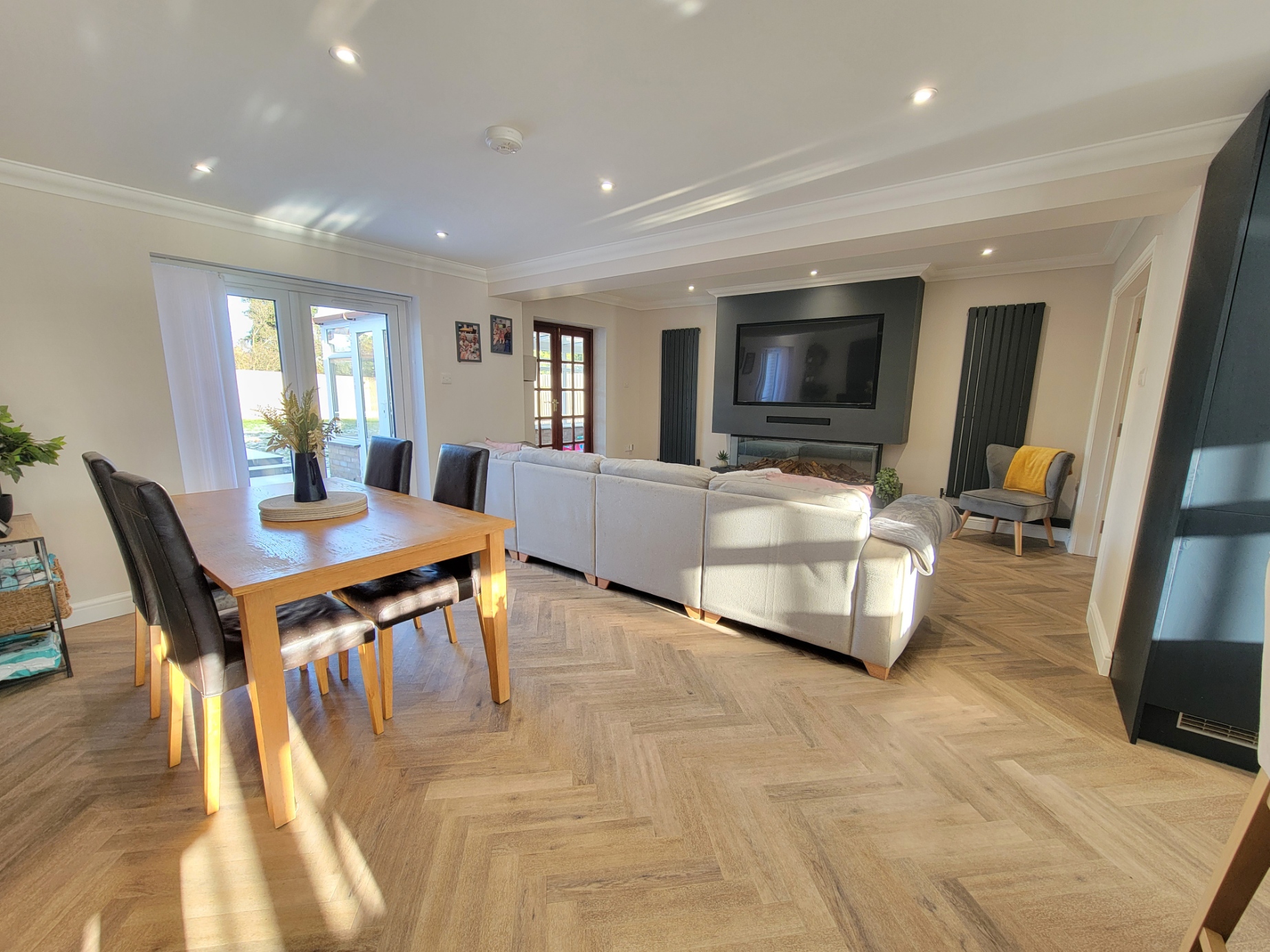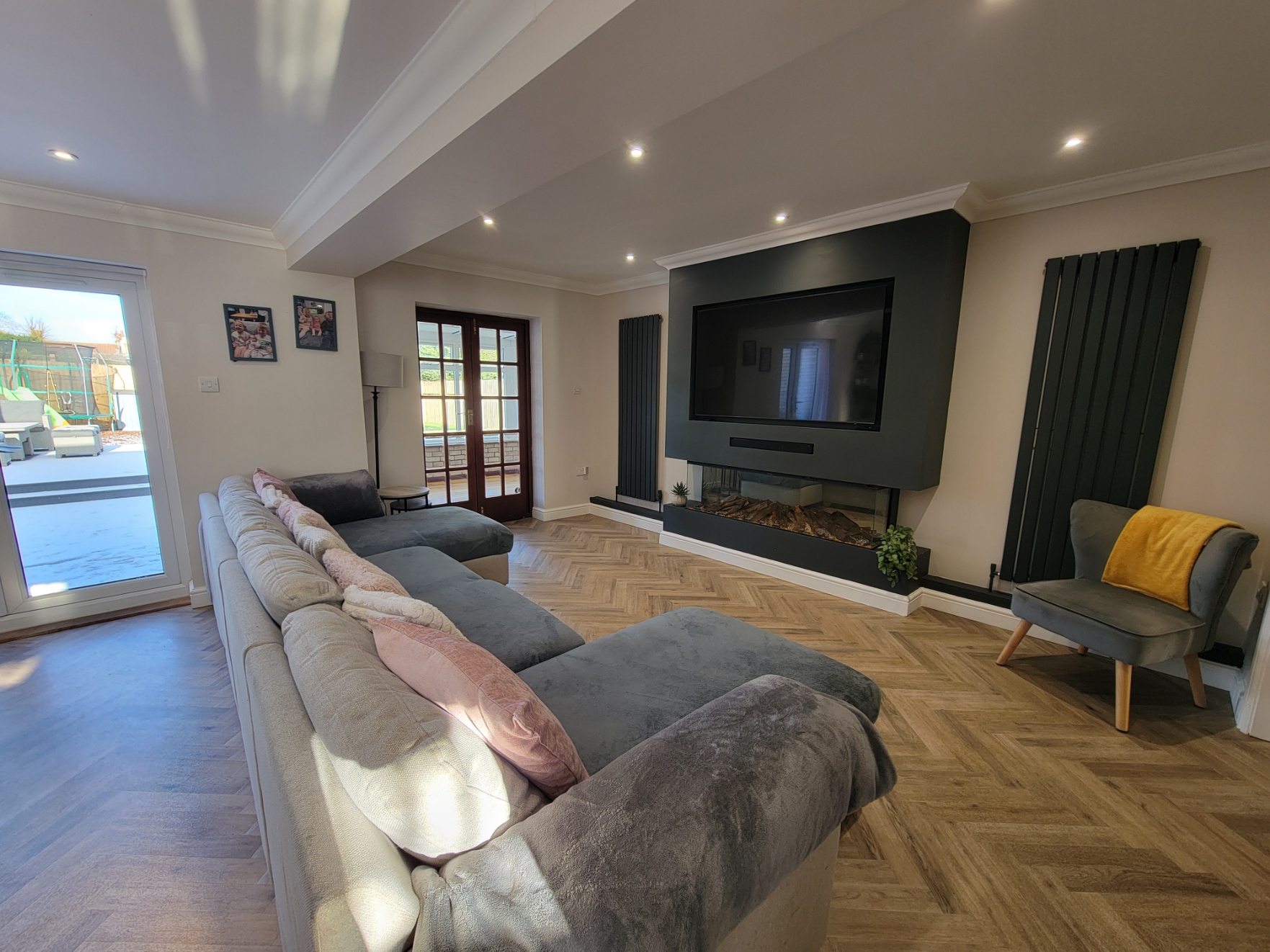A stunning room of generous proportions with matching herringbone Karndean wood effect flooring throughout, feature media wall with inset tv, log and flame effect feature electric fire, PVC double glazed French doors opening to the rear garden.