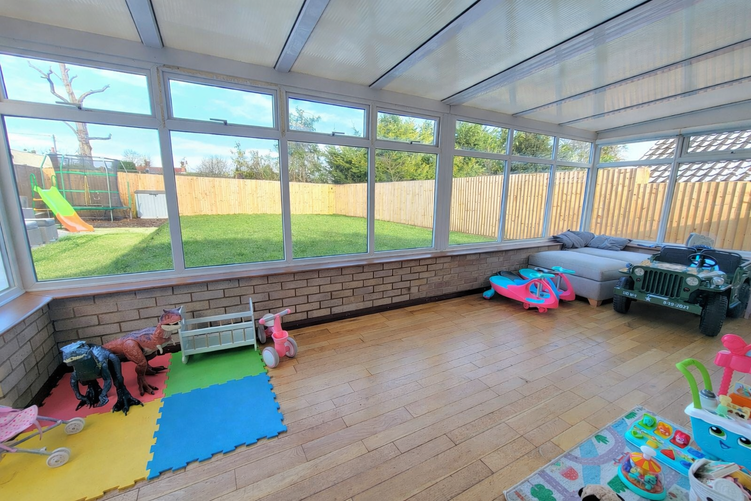 Of generous proportions, PVC double glazed windows upon a matching brick plinth, mono pitched roof, solid wood strip flooring, French doors opening to the decking and garden.