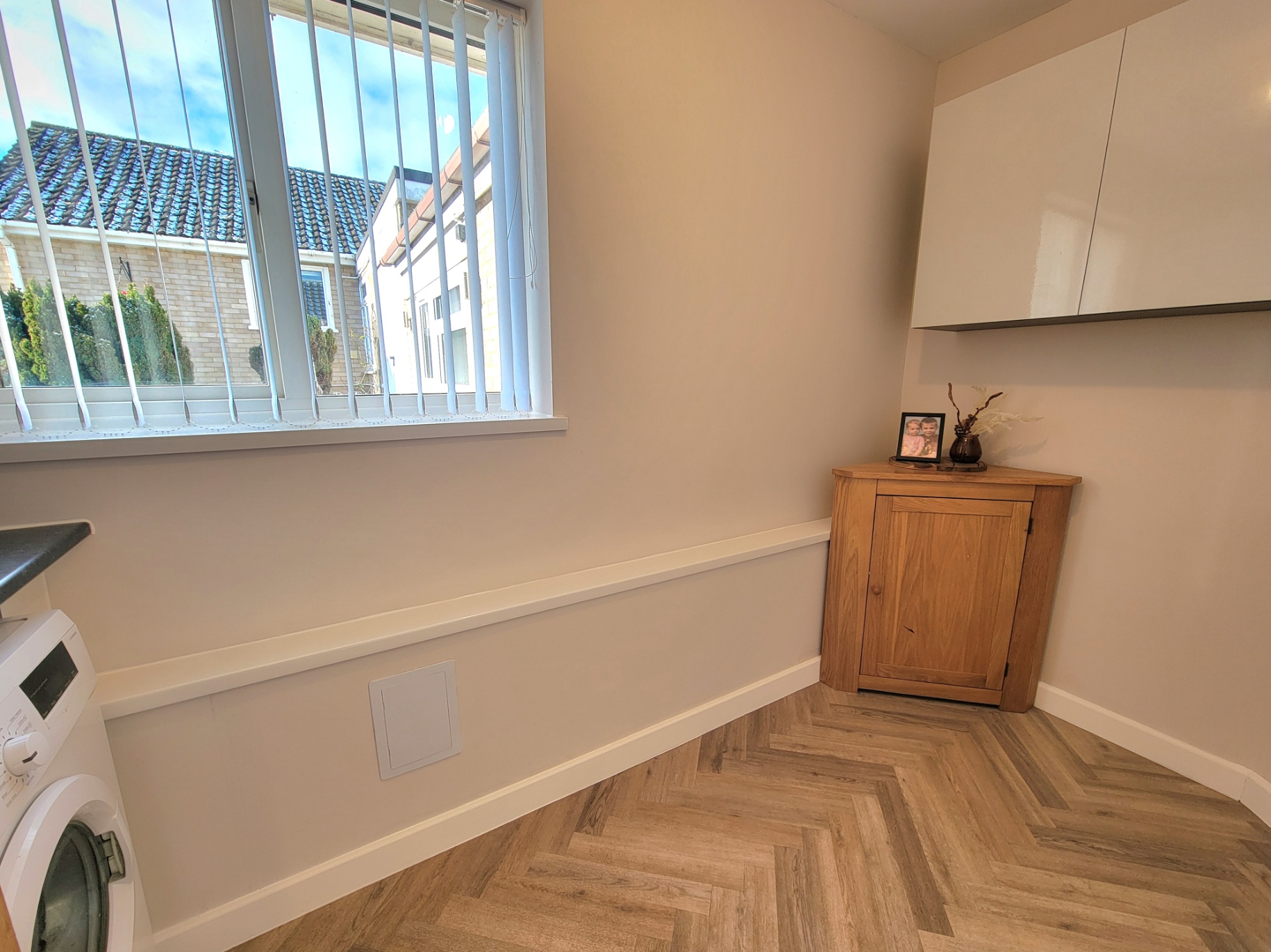 Radiator, fitted worktop, plumbing for washing machine, space for tumble dryer, herringbone wood effect flooring, PVC double glazed window to the side aspect.