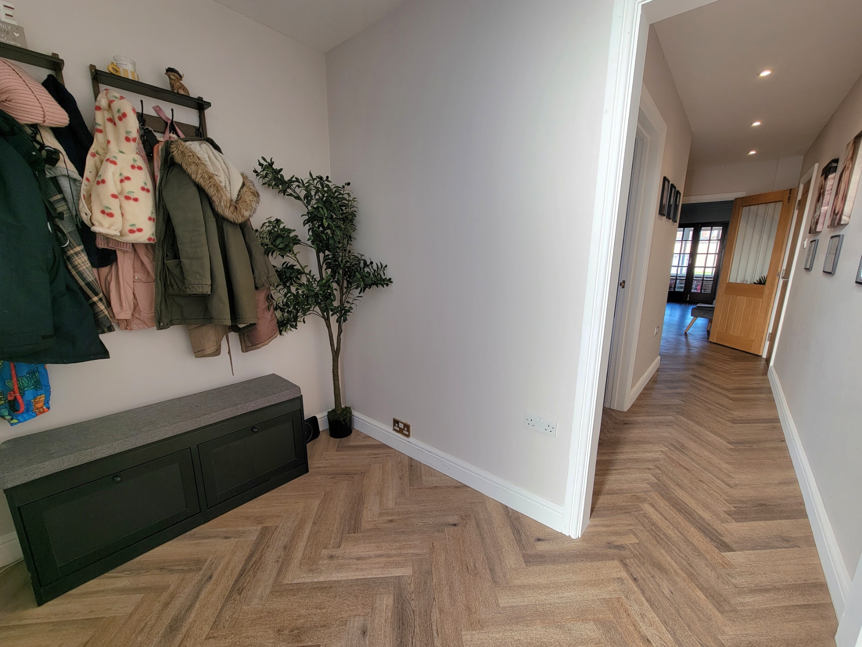 PVC double glazed entrance door, inset spotlights, radiator, attractive herringbone wood effect flooring, part glazed solid oak internal doors, leads to the living space with half glazed double oak doors.