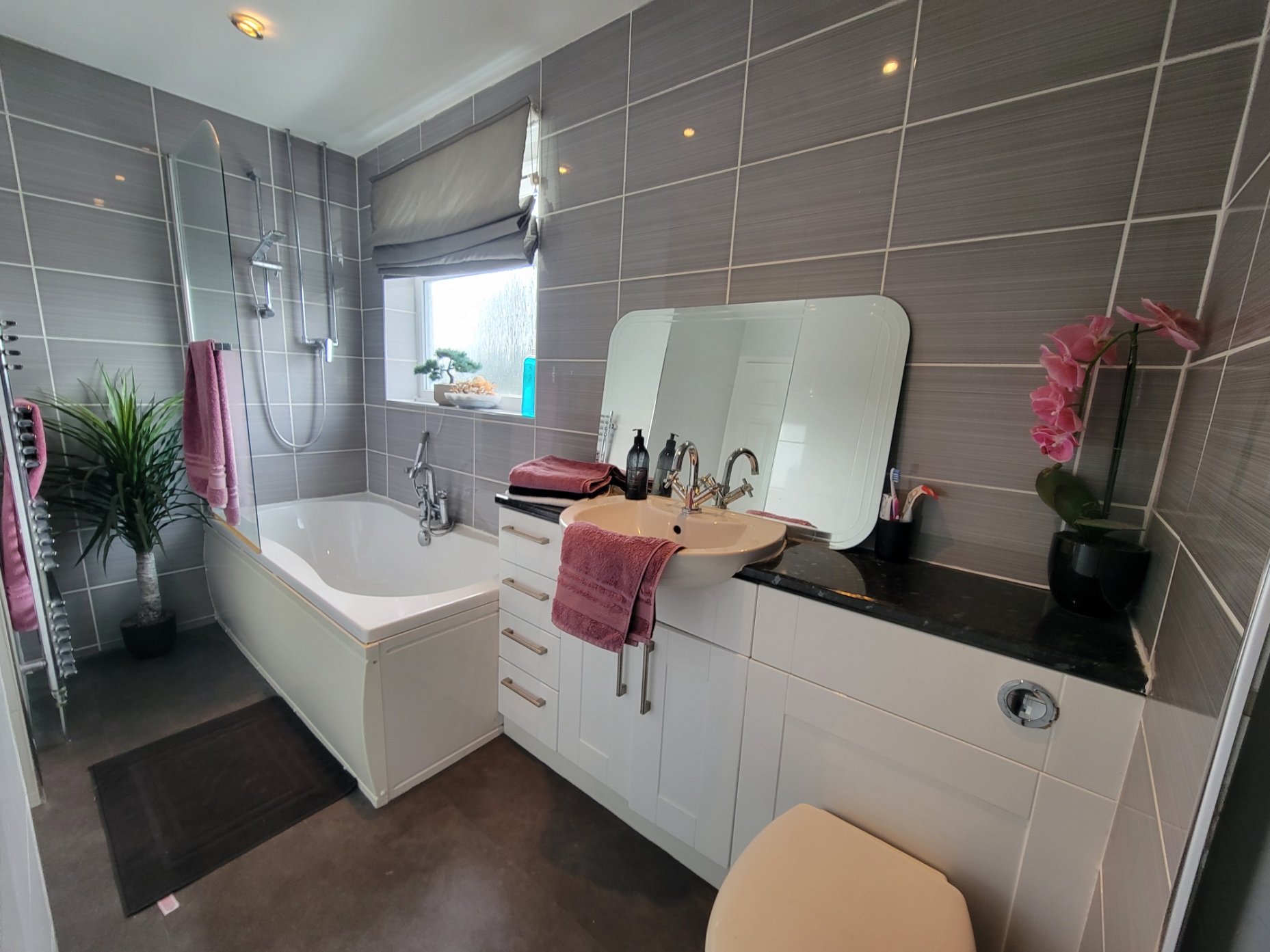 Modern white suite comprises inset low level wc with concealed cistern, deep panelled bath with traditional style shower mixer tap and further shower connected over with pivot glazed screen and generous vanity unit inset ceramic wash hand basin with mixer tap and storage cupboard and drawers below, chrome towel radiator, inset spotlights, attractive fully tiled walls, PVC double glazed window to the side aspect.