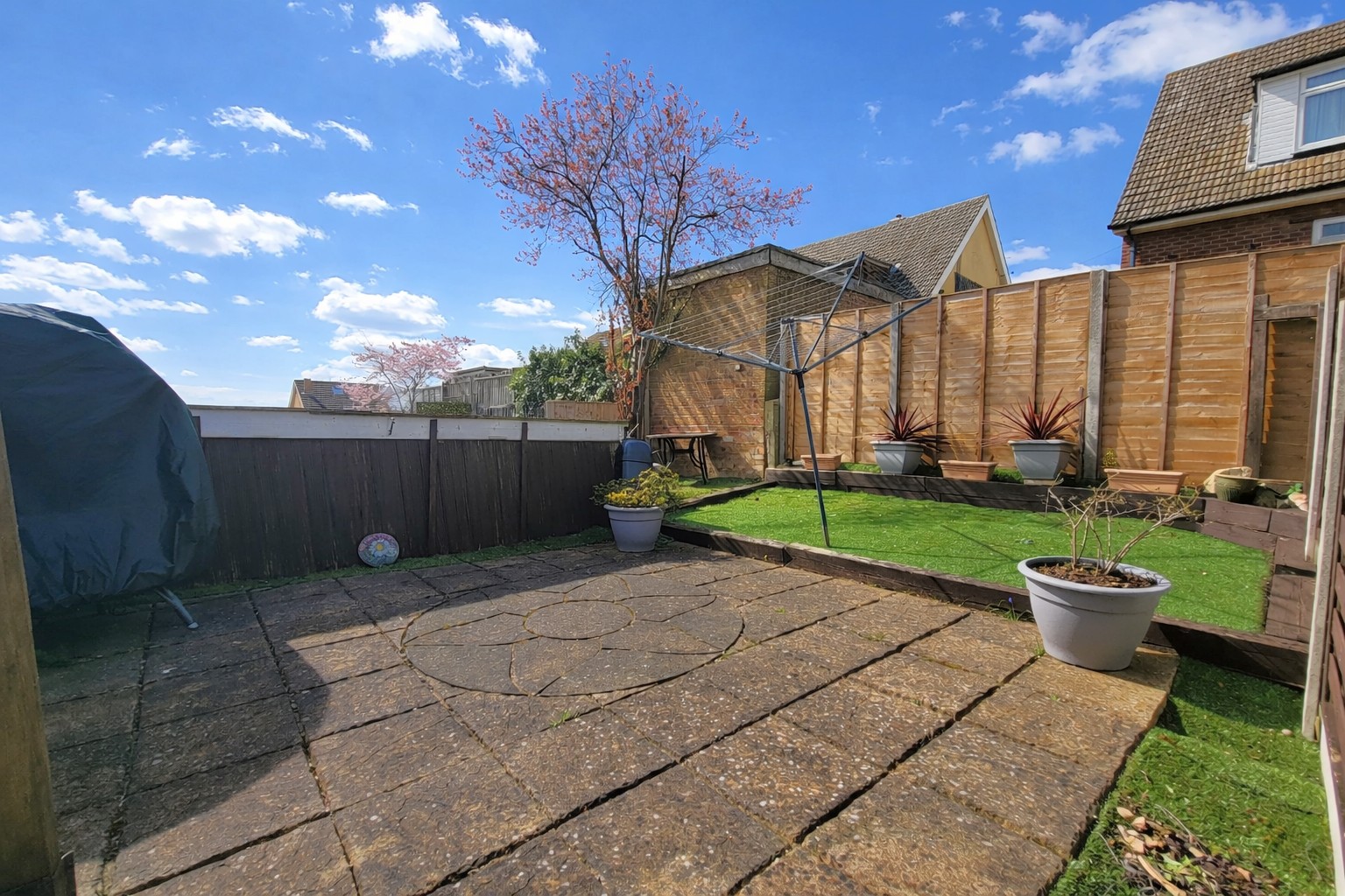 The property is set nicely back from the road with low maintenance artificial lawned front garden. Block paved drive to the side provides off road parking for two/three cars and leads to a good size garage/store with up and over door. Gated pedestrian access leads to the lower patio, steps lead to a raised terrace with circular feature, galleried balustrading opening to an artificial lawn, fenced boundaries.