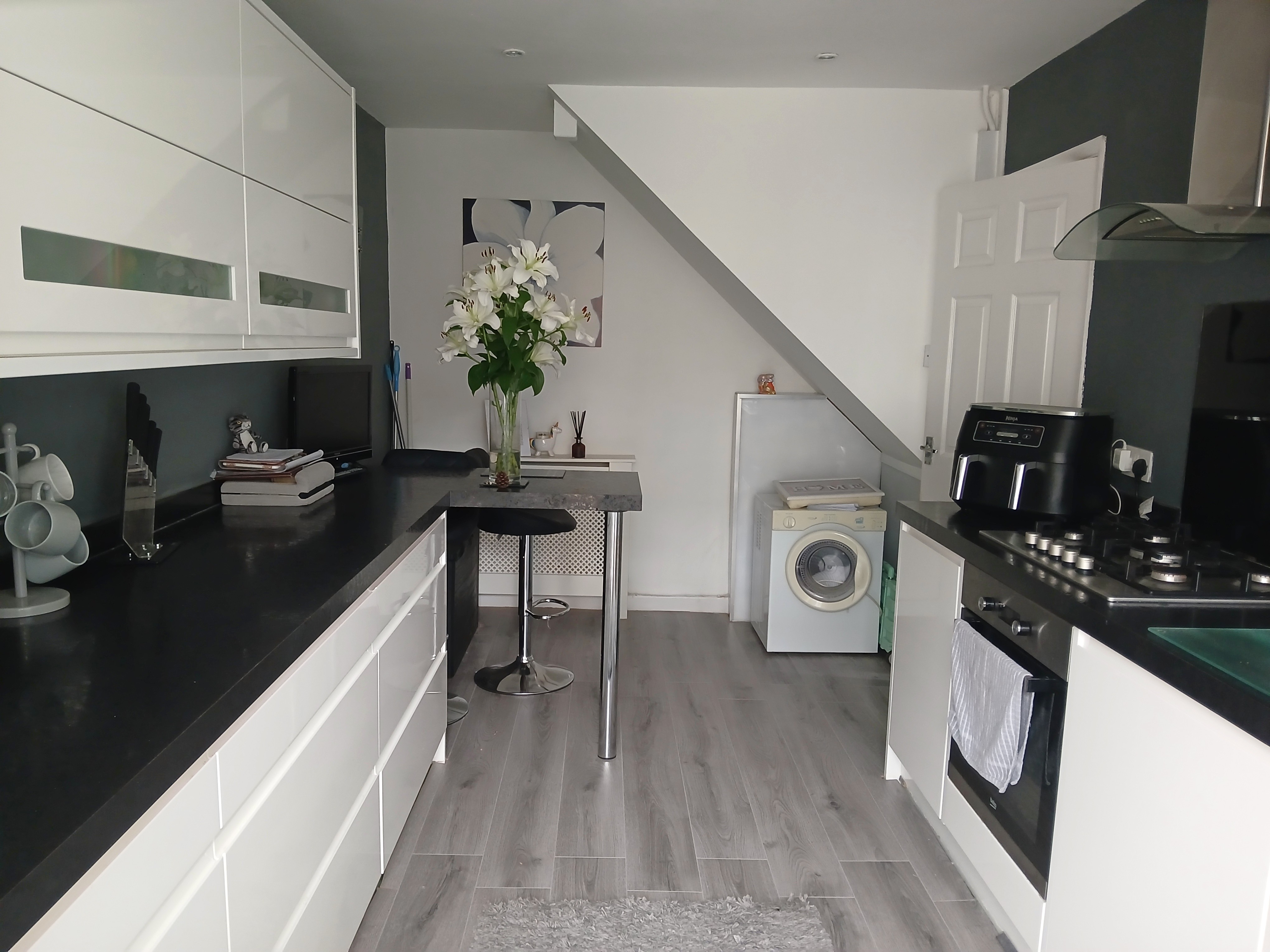 17' 3 " x 8' 9" (5.26m x 2.67m) Upgraded contemporary style kitchen with an extensive range of base and wall mounted units having high gloss white doors and drawer fronts, an array of wide pan drawers providing good amounts of storage, granite style worktops, inset stainless steel single bowl sink unit with mixer tap, plumbing and space for washing machine, built-in good quality stainless steel and glass fan assisted oven, five burner gas hob, stainless steel and glass extractor connected over, integrated breakfast bar, inset spotlights, space for fridge/freezer, attractive wood strip flooring, radiator, half glazed PVC door and window opening to the rear garden.