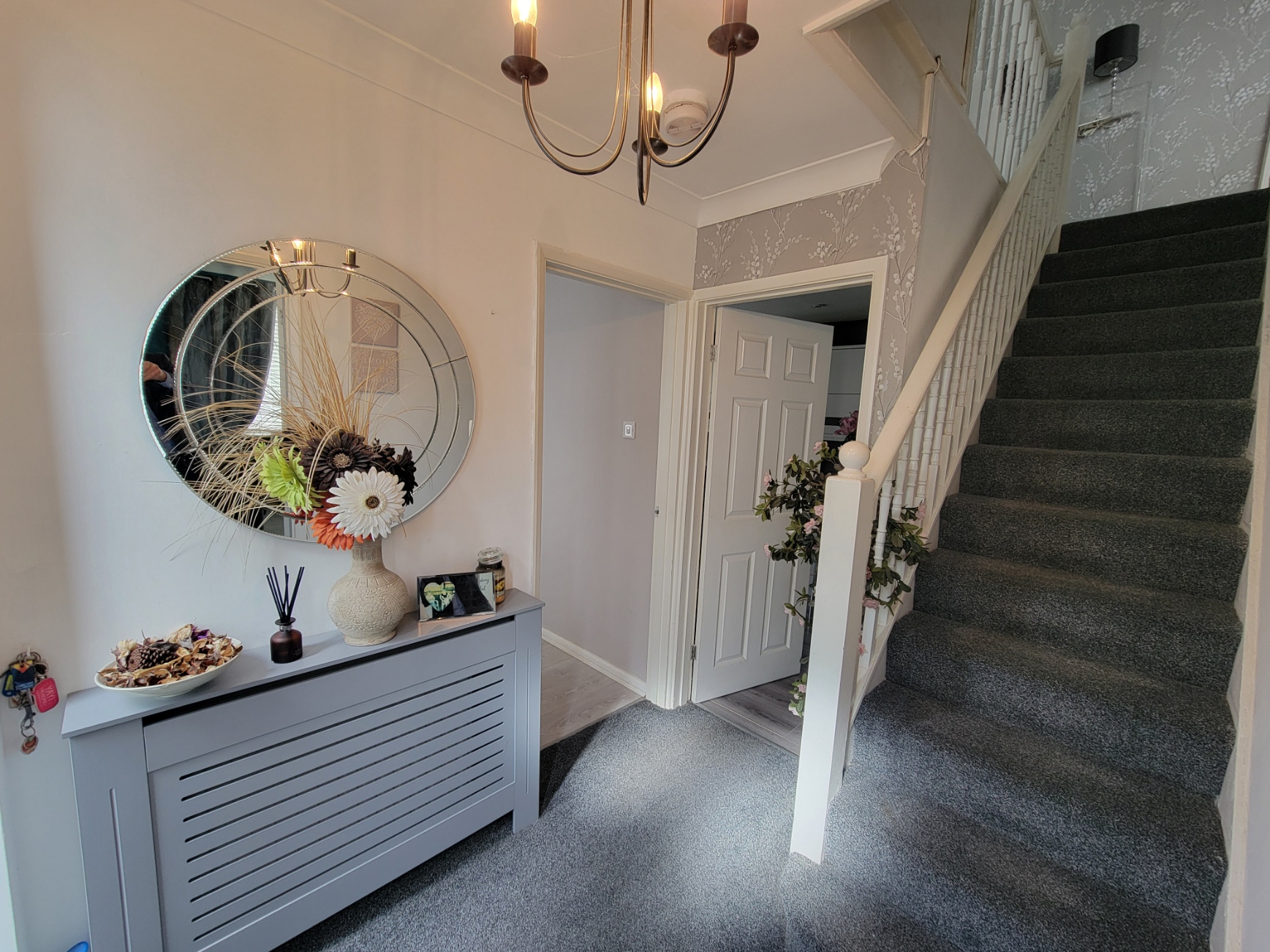 7' 7" x 5' 9" (2.31m x 1.75m) PVC double glazed entrance door with side windows, staircase to the first floor, radiator with decorative cover.