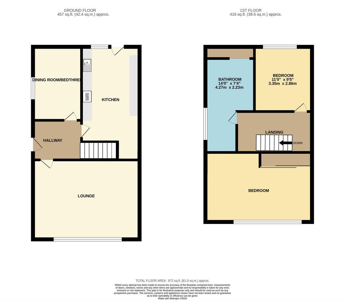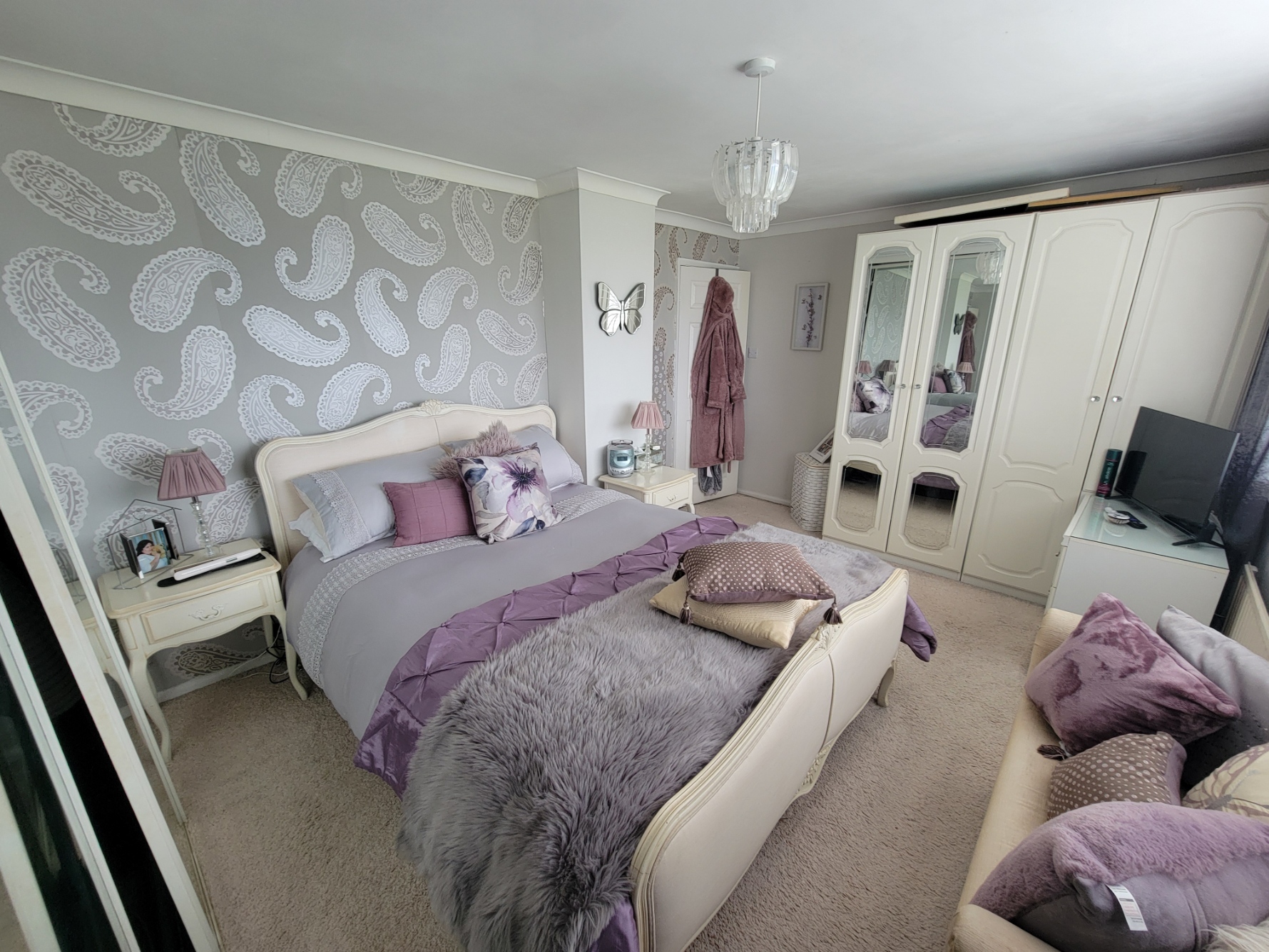 14' 4" x 10' 6" (4.37m x 3.2m) Radiator, space for king size bed, built-in full height triple wardrobe with mirrored doors inset fitted shelves and hanging rails, large PVC double glazed picture window to the front aspect with views.