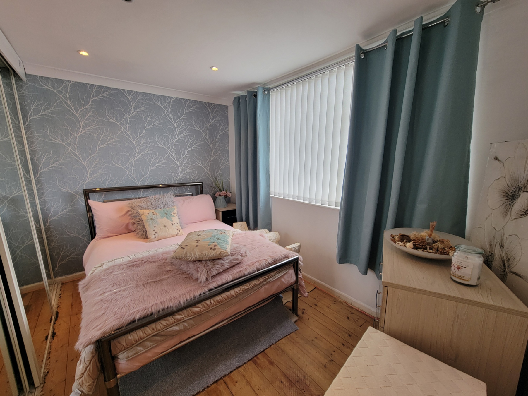 11' 4 " x 9' 7" (3.45m x 2.92m) Radiator, inset spotlights, exposed timber floor, built-in triple wardrobe with sliding mirrored doors inset fitted shelves and hanging rails, PVC double glazed window overlooking the rear garden.