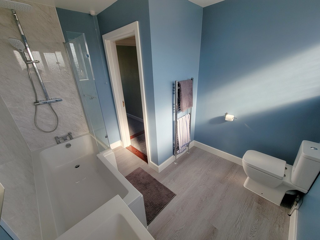 FAMILY BATHROOM: 10' 15" x 8' 5 " (3.43m x 2.57m) At longest points. Re-fitted modern white suite comprises low level wc, shower bath with dual rainfall shower connected over, pivot glazed screen and shower boarding and vanity unit with inset wash hand basin, mono mixer tap and storage drawers below, heated towel rail, wood effect flooring, two PVC double glazed windows to the rear aspects.