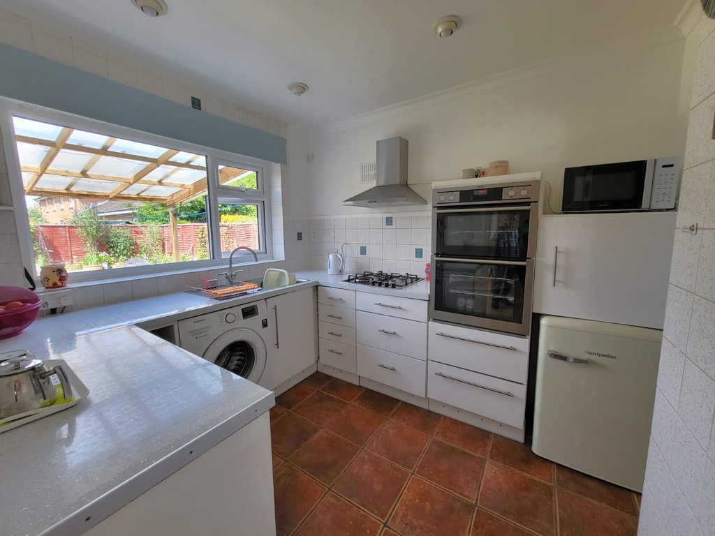 KITCHEN: 9' 10" x 8' 7" (3m x 2.62m) Fitted with a range of base storage units having white doors and drawer fronts, fitted worktops inset with single bowl sink unit with mixer tap, built-in eye level stainless steel and glass double oven, four ring gas hob, extractor fan connected over, plumbing for washing machine, space for low level fridge and freezer, tiled floor, built-in pantry cupboard, large PVC double glazed window overlooking the rear garden.