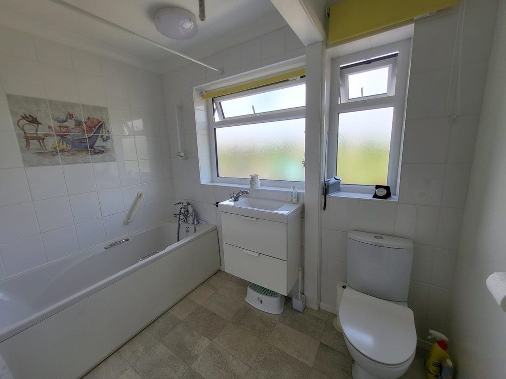 BATHROOM: Modern white suite comprises low level wc, pedestal wash hand basin and panel bath with shower connected over, fully tiled walls, radiator, two PVC double glazed windows to the rear aspect.