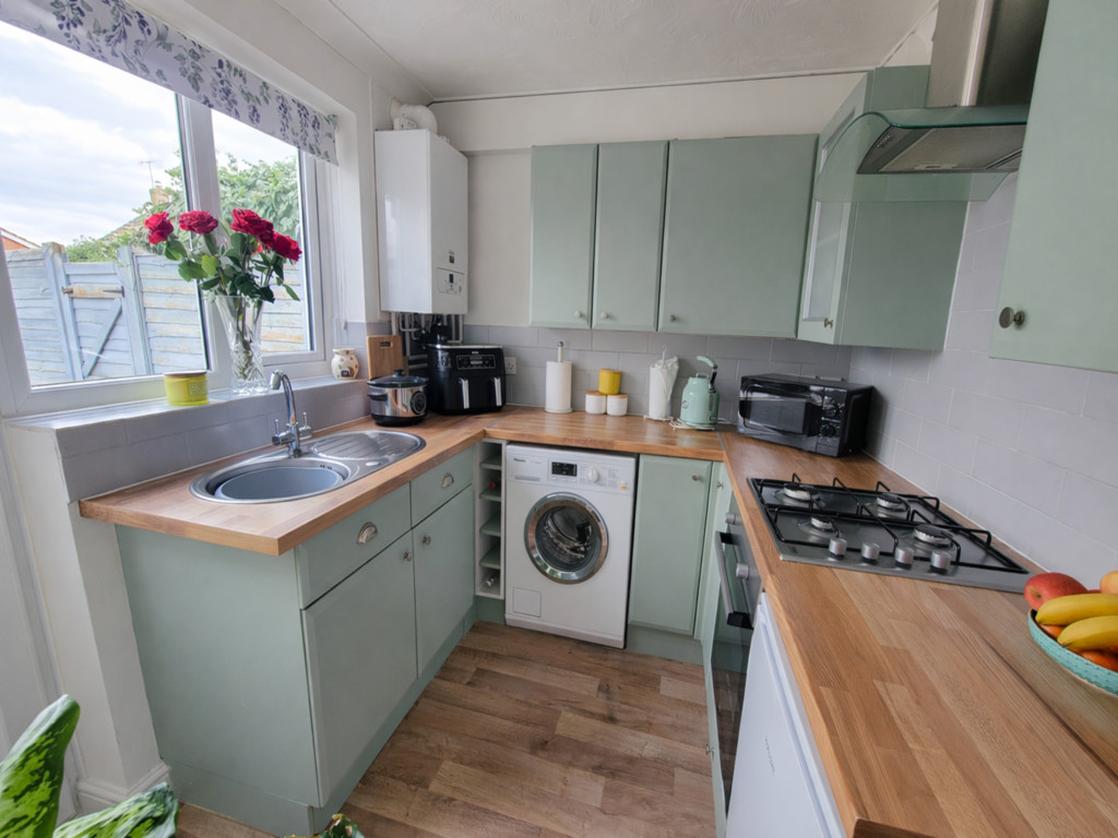 KITCHEN: 9' 2" x 7' 5" (2.79m x 2.26m) Fitted with a good range of base and wall mounted units having soft green painted style doors and drawer fronts, fitted worktops inset with stainless steel single bowl sink unit with mixer tap, plumbing for washing machine, space for fridge/freezer, built-in stainless steel and glass oven, inset stainless steel and gas hob with extractor connected over, decorative tiled splash backs, wood effect flooring, wall mounted gas fired boiler, PVC double glazed window and half glazed PVC door opening to the garden.