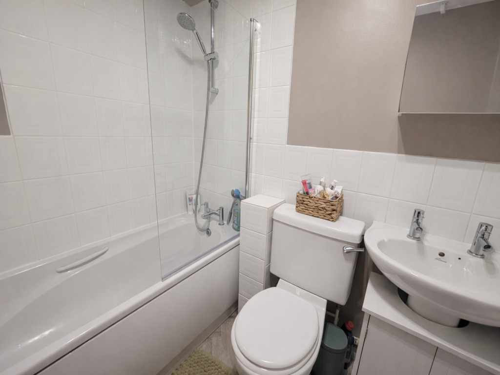 BATHROOM: White suite comprises panel bath with shower mixer tap, low level wc and pedestal wash hand basin, built-in deep understairs storage cupboard, tiled splash backs, extractor fan.