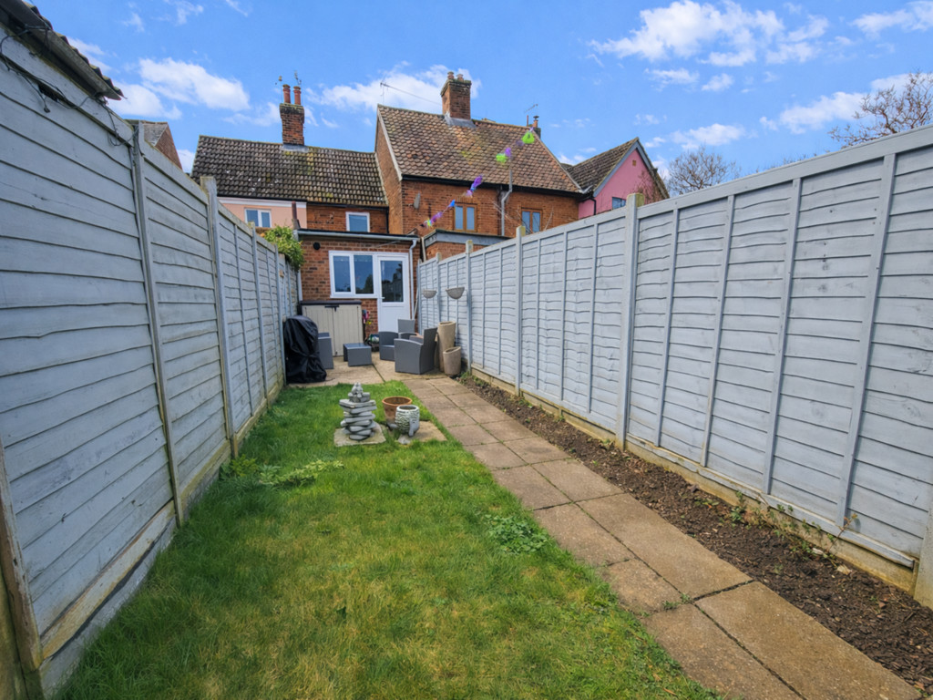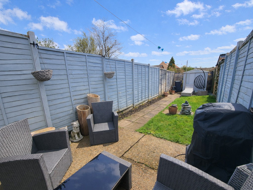OUTSIDE: Pedestrian access via the neighbouring property leads to a secure gate giving access to the long rear garden comprising patio area leading to a good size lawn with fenced boundaries and metal storage shed. The garden is relatively un-overlooked.