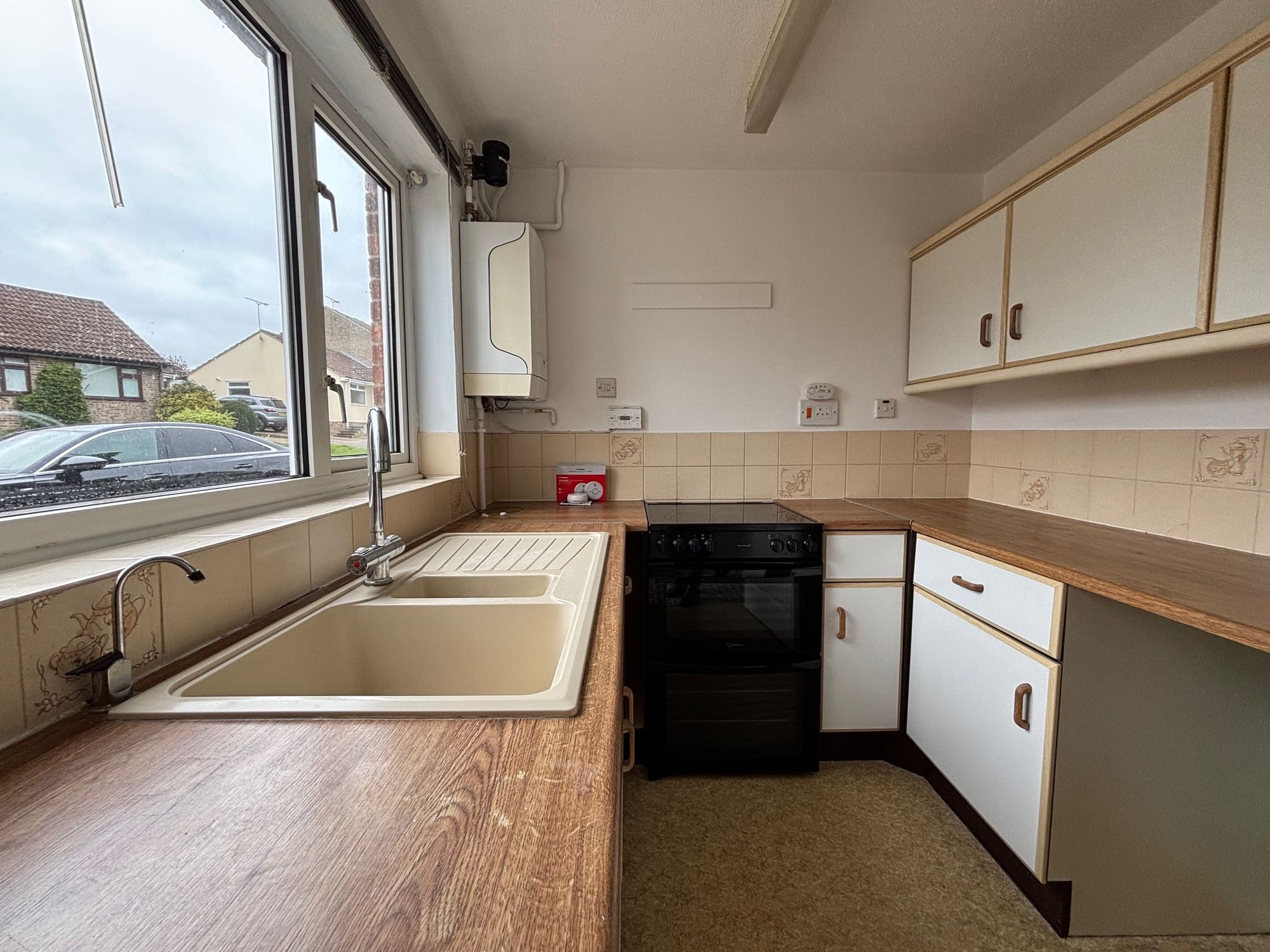 Fitted with a range of wall and base units, ceramic one-and-a-half bowl sink with drainer, and space for appliances. Double glazed window to the front aspect and the gas boiler.