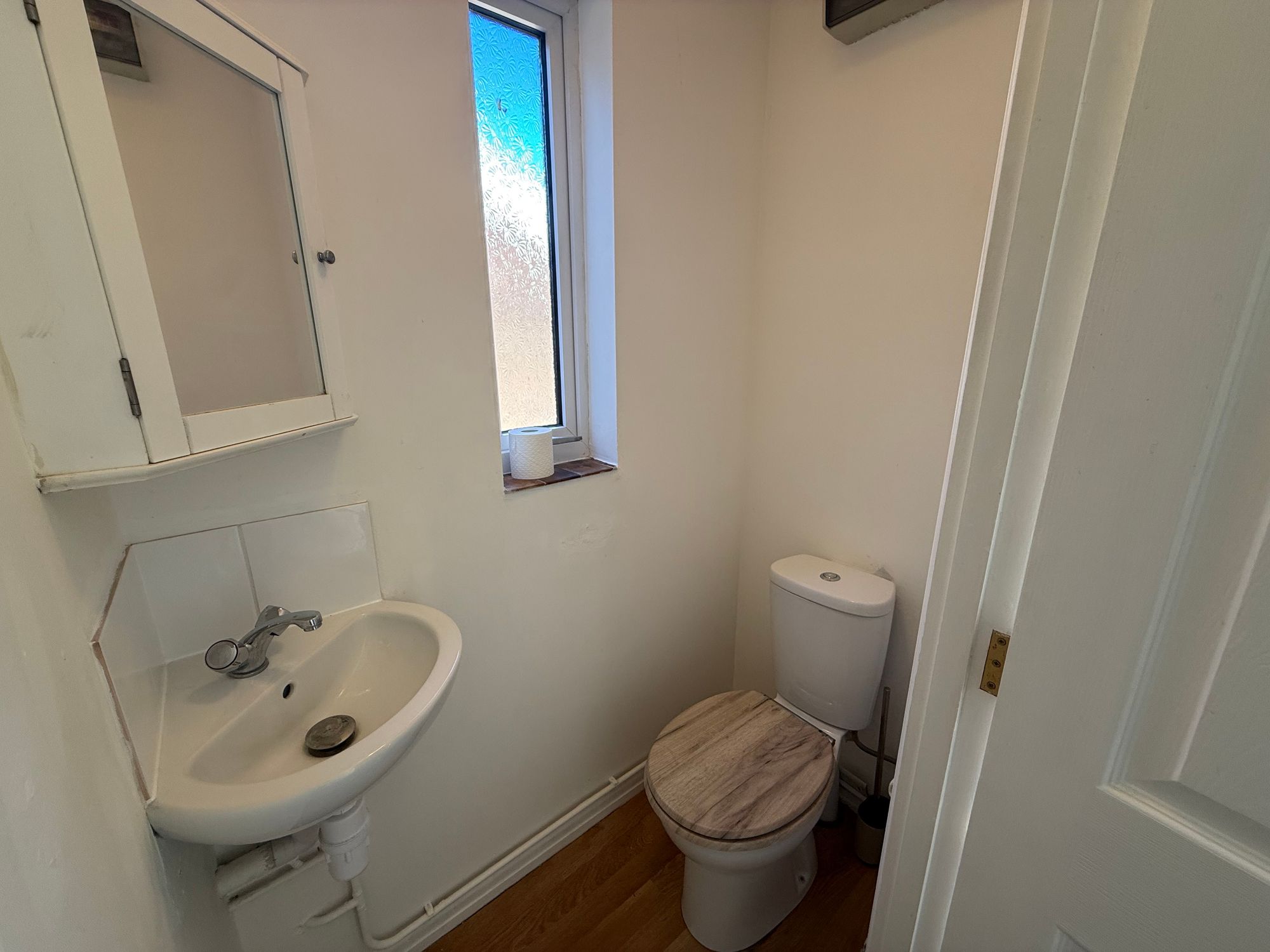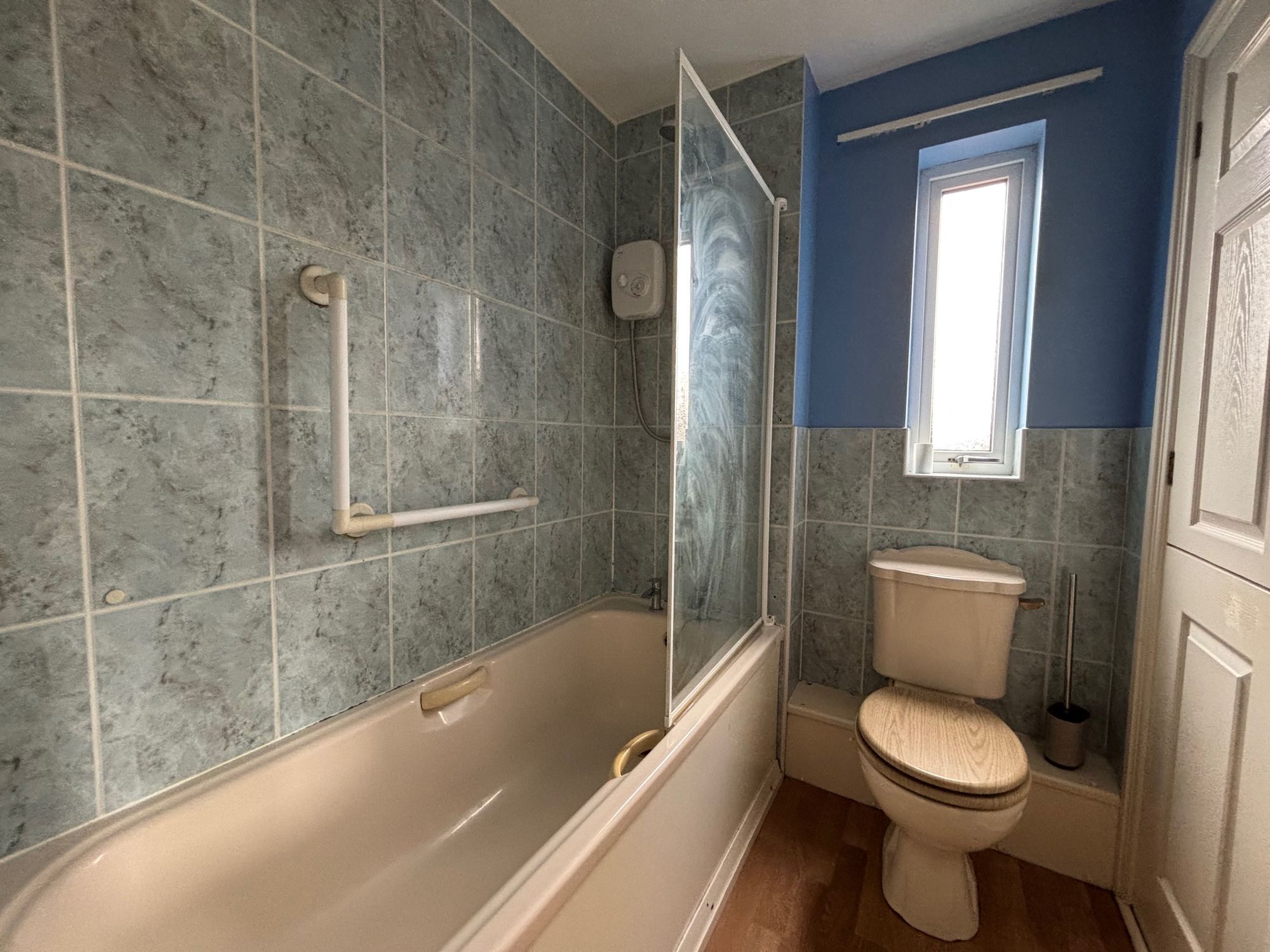 Fitted with a panelled bath, low level WC, hand basin, and double glazed window.