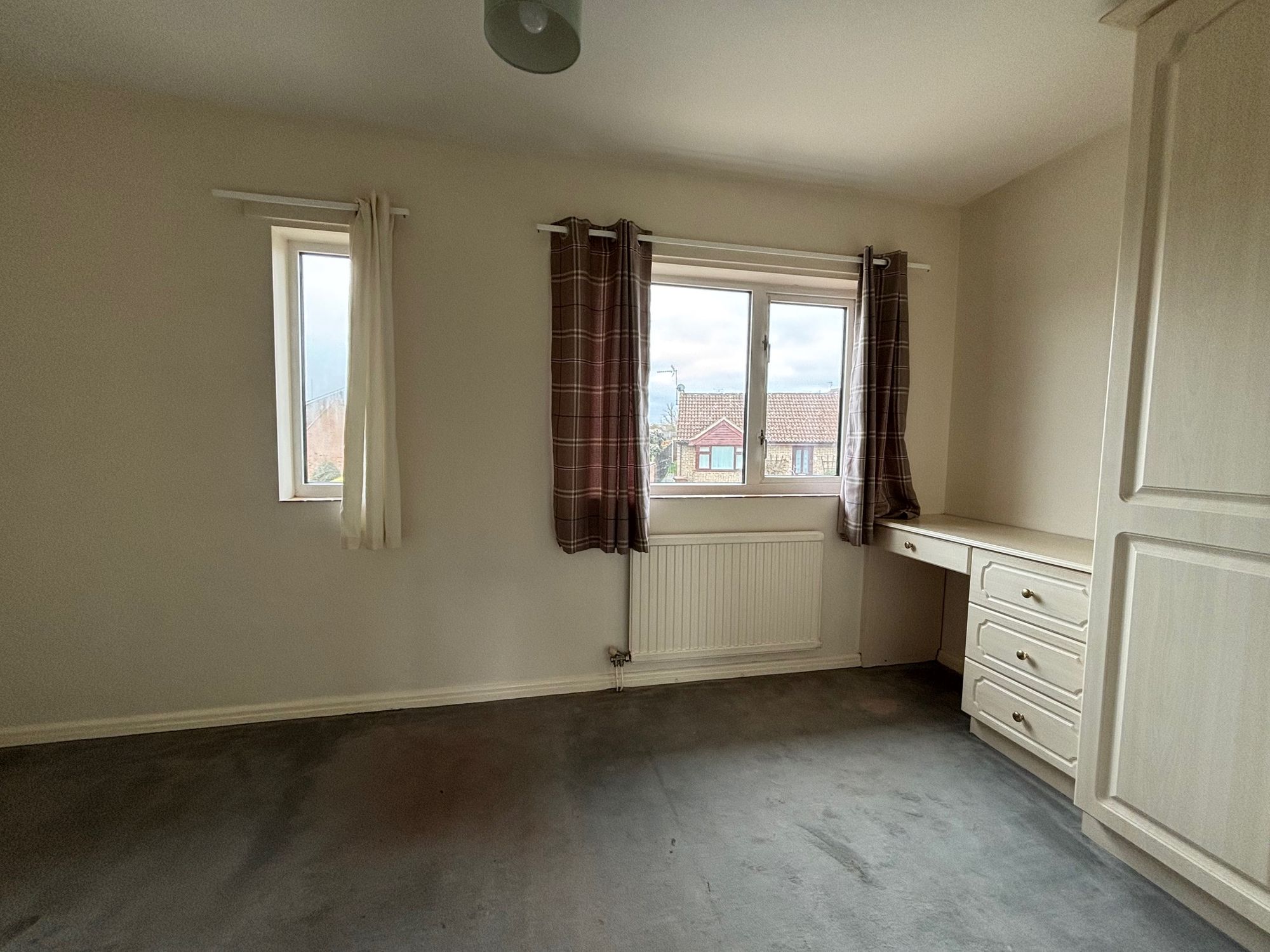 A well-proportioned double bedroom with built-in cupboards, wall-mounted radiator, and double glazed window to the front.