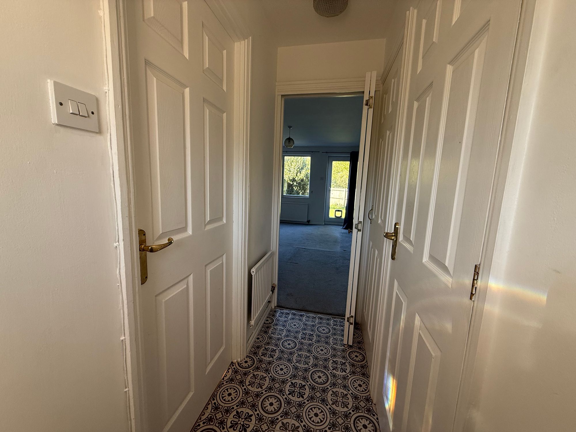 Front door opening into a entrance hall with tiled flooring, useful storage cupboard, and doors leading to: