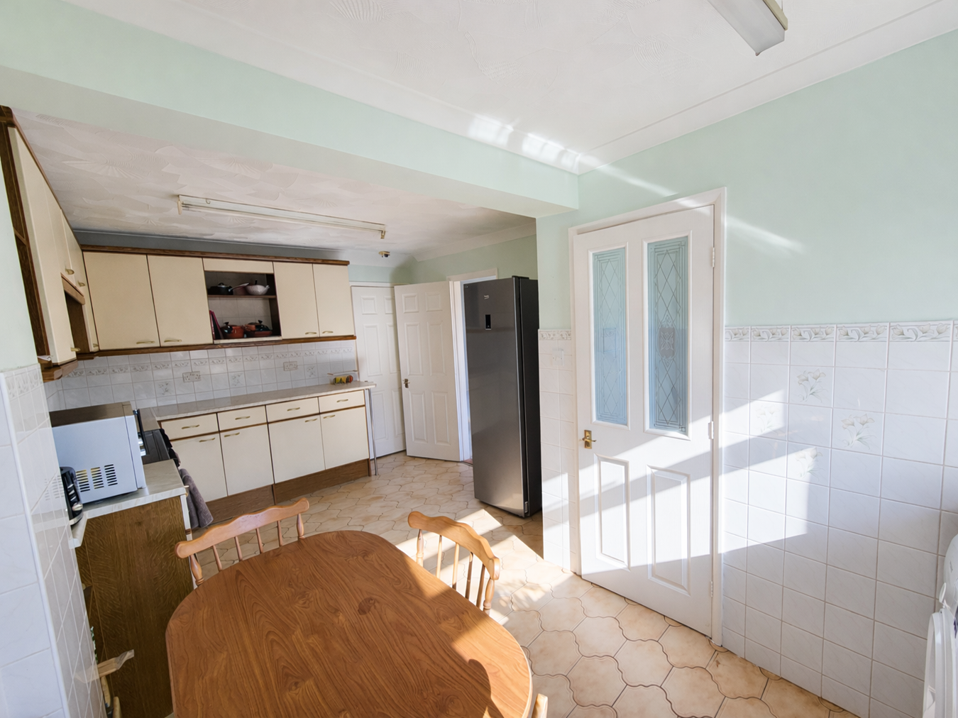 18' 8" x 11' 5 " (5.69m x 3.48m) Fitted with a good range of base and wall mounted units, fitted worktops inset one and a half bowl sink unit with mixer tap, tiled splashbacks, cooker space, space and plumbing for washing machine, space for fridge/freezer, radiator, PVC double glazed window to the rear aspect.