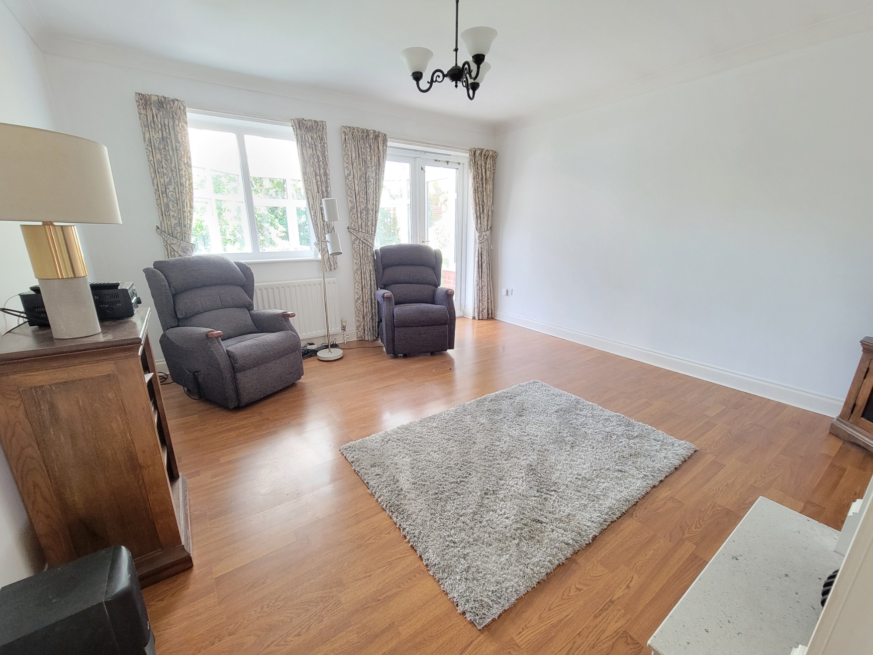 Sitting room: 14' 4" x 13' 5" (4.37m x 4.09m) Wood effect flooring, tv point, radiator, feature Adam style fireplace with decorative wooden surround, marble back and hearth inset with gas flame effect fire, PVC double glazed window to the rear aspect, glazed wooden French doors open to the conservatory.