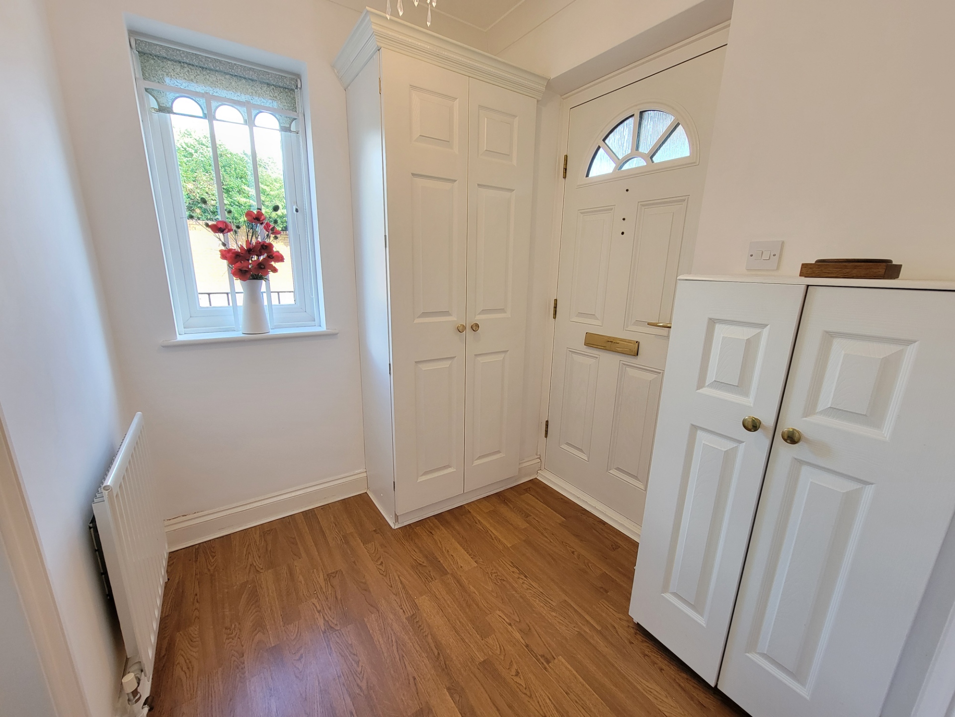Entrance hall: 6' 8" x 5' 9" (2.03m x 1.75m) Built-in full height cloaks cupboard with double doors, wood effect flooring, radiator, shelved shoe cupboard with double doors, PVC double glazed window to the side aspect.