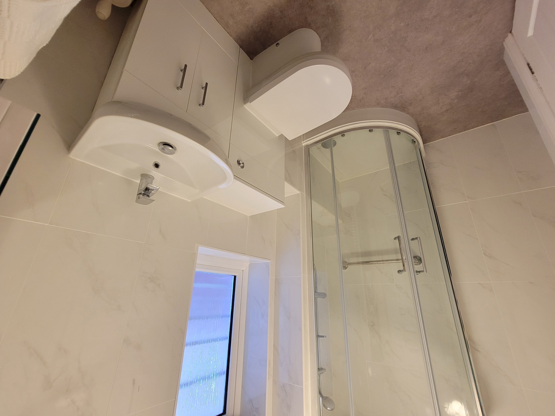 Shower room: Of contemporary design with low level wc with concealed cistern, built-in vanity storage unit with inset wash hand basin and independent curved shower enclosure with glazed screen, fully tiled walls, tiled floor, chrome towel radiator, built-in shelved linen cupboard, PVC double glazed window to the side aspect.