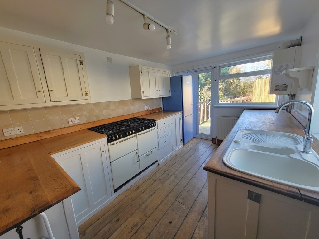 KITCHEN: 13' 4" x 8' 9" (4.06m x 2.67m) Fitted with an extensive range of shaker style handmade base and wall mounted units with painted doors, thick solid wood worktops inset with ceramic sink, gas fired range cooker, tiled splash backs, solid oak boarded floor, wall mounted gas fired boiler, stairs to the garden, PVC double glazed windows to the side and rear aspects, PVC double glazed French doors opening to the raised deck.