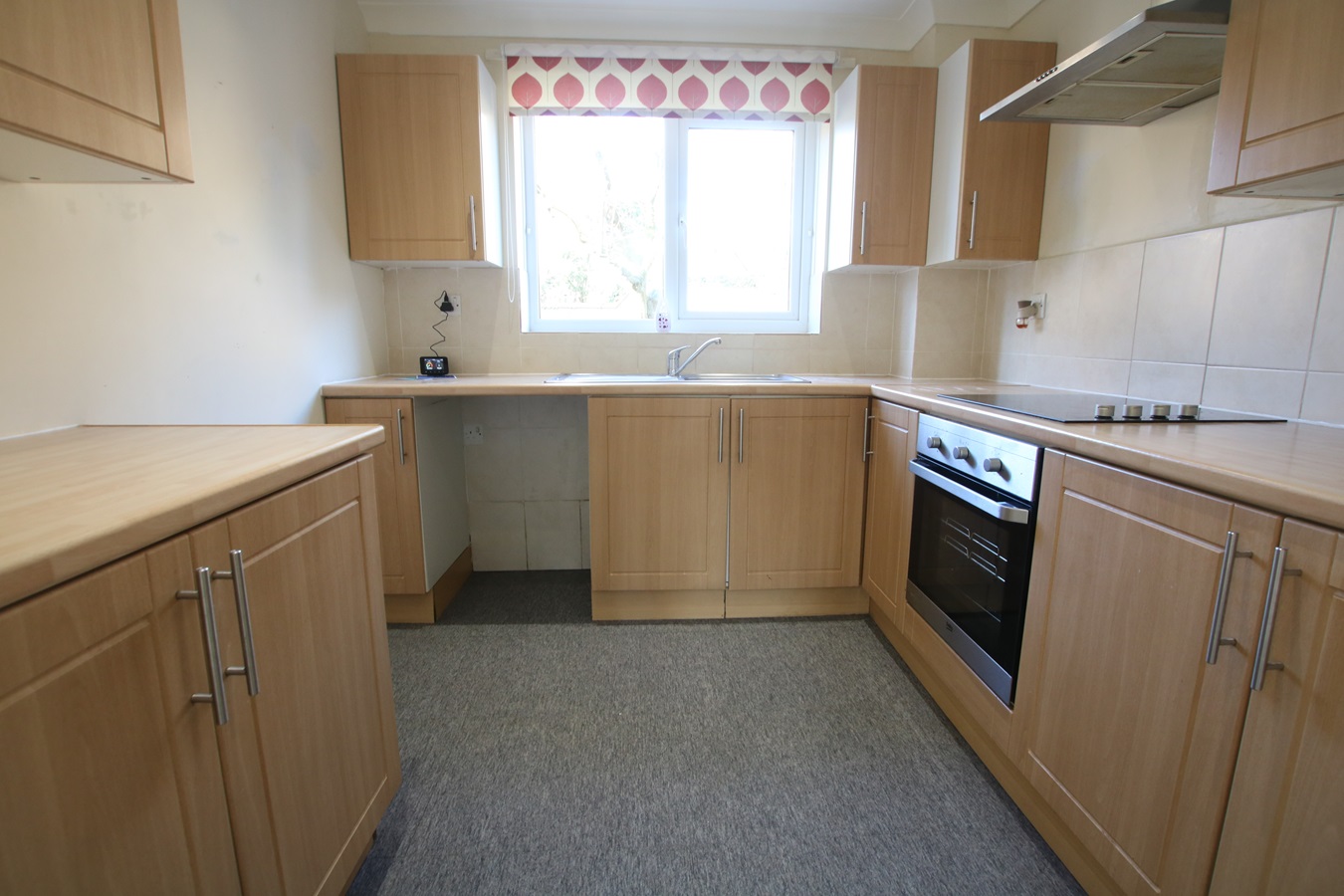 8' 6" x 8' 3" (2.59m x 2.51m) Fitted with a good range of base and wall mounted units having wood effect doors and drawer fronts, fitted worktops inset with stainless steel single bowl sink unit with mixer tap, plumbing for washing machine, inset ceramic hob with stainless steel extractor fan connected over, integrated stainless steel and glass fan assisted oven, PVC double glazed window to the front aspect.