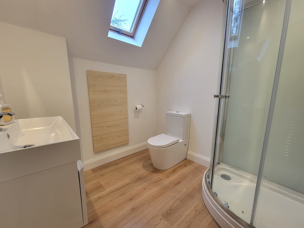EN-SUITE: 8' 3 " x 6' 9" (2.51m x 2.06m) Suite comprises low level wc, independent shower enclosure with curved glazed screen and built-in vanity unit with large storage drawer and inset wide wash hand basin, eaves storage cupboards, radiator, inset spotlights, Velux roof window.