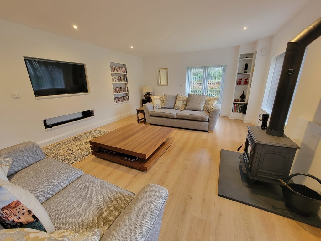 SITTING ROOM: 19' 0" x 13' 4" (5.79m x 4.06m) Wood effect flooring, media space with inset tv, feature wood burning stove with thick solid slate hearth, inset spotlights, built-in shelved handmade bookcases, three generous windows and French doors to the side provide good amounts of natural light.
