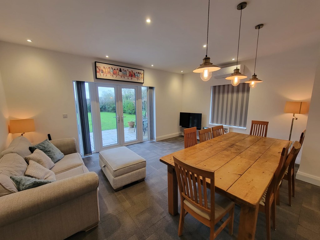 Inset spotlights, window to the side aspect, wide French doors and side lights opening to the rear garden.