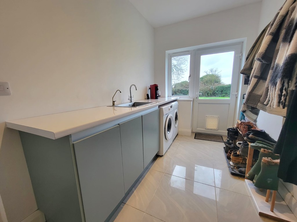 UTILITY ROOM: 12' 4" x 7' 3 " (3.76m x 2.21m) Fitted base units with sleek doors, quartz effect worktop inset square stainless steel sink with mono mixer tap, water softener with drinking water tap, plumbing for washing machine space for tumble dryer, glazed tiled flooring, personal door leads directly to the garage, half glazed door and window opening to the garden.