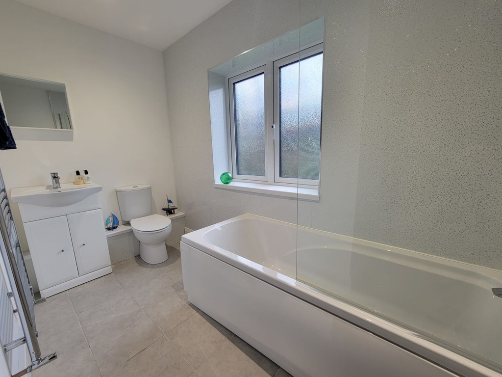 GROUND FLOOR BATHROOM: 10' 7" x 5' 2" (3.23m x 1.57m) Suite comprises panel bath with shower mixer tap and pivot glazed screen, low level wc and vanity unit with ceramic wash hand basin, mono mixer tap and storage cupboards below, chrome towel radiator, inset spotlights, tiled floor, window to the side aspect.