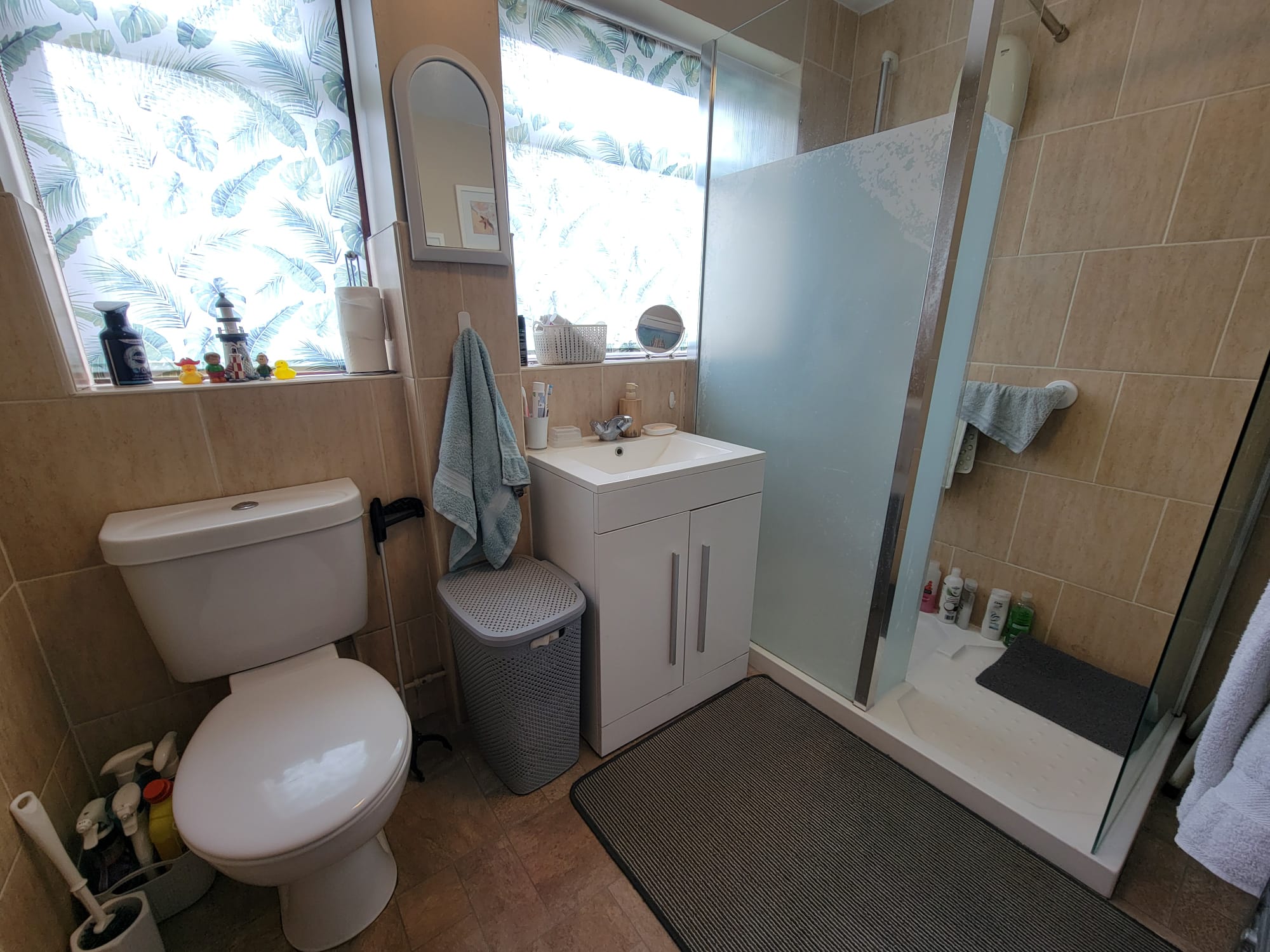 Modern suite comprises vanity unit with inset wash hand basin, low level wc and double sized shower enclosure with fixed glazed screen, part tiled walls, chrome towel radiator, two double glazed windows to the rear aspect.