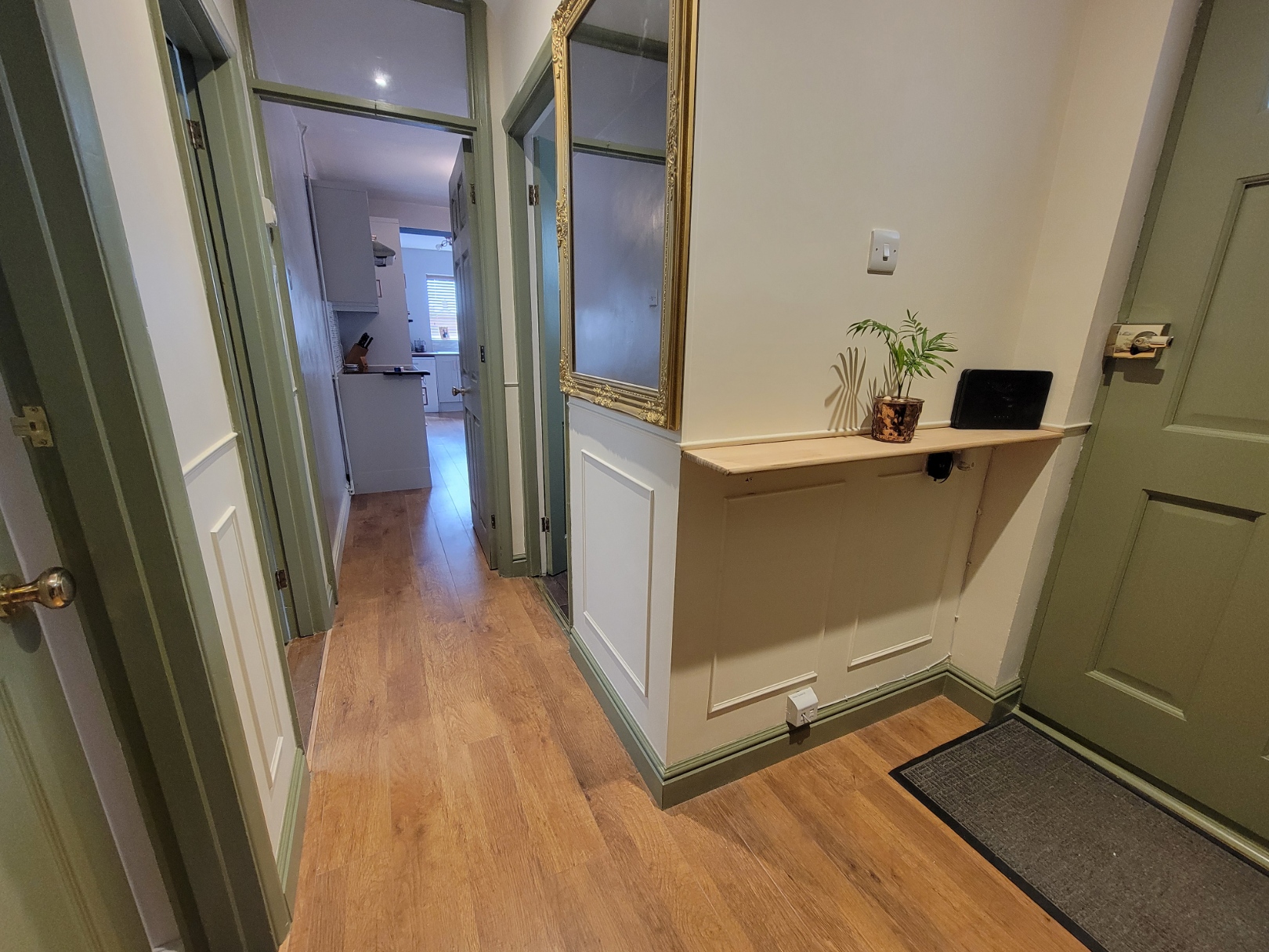Wood panelled entrance door, wood effect flooring, access to the loft space with fitted ladder, radiator, lower wall panelling.