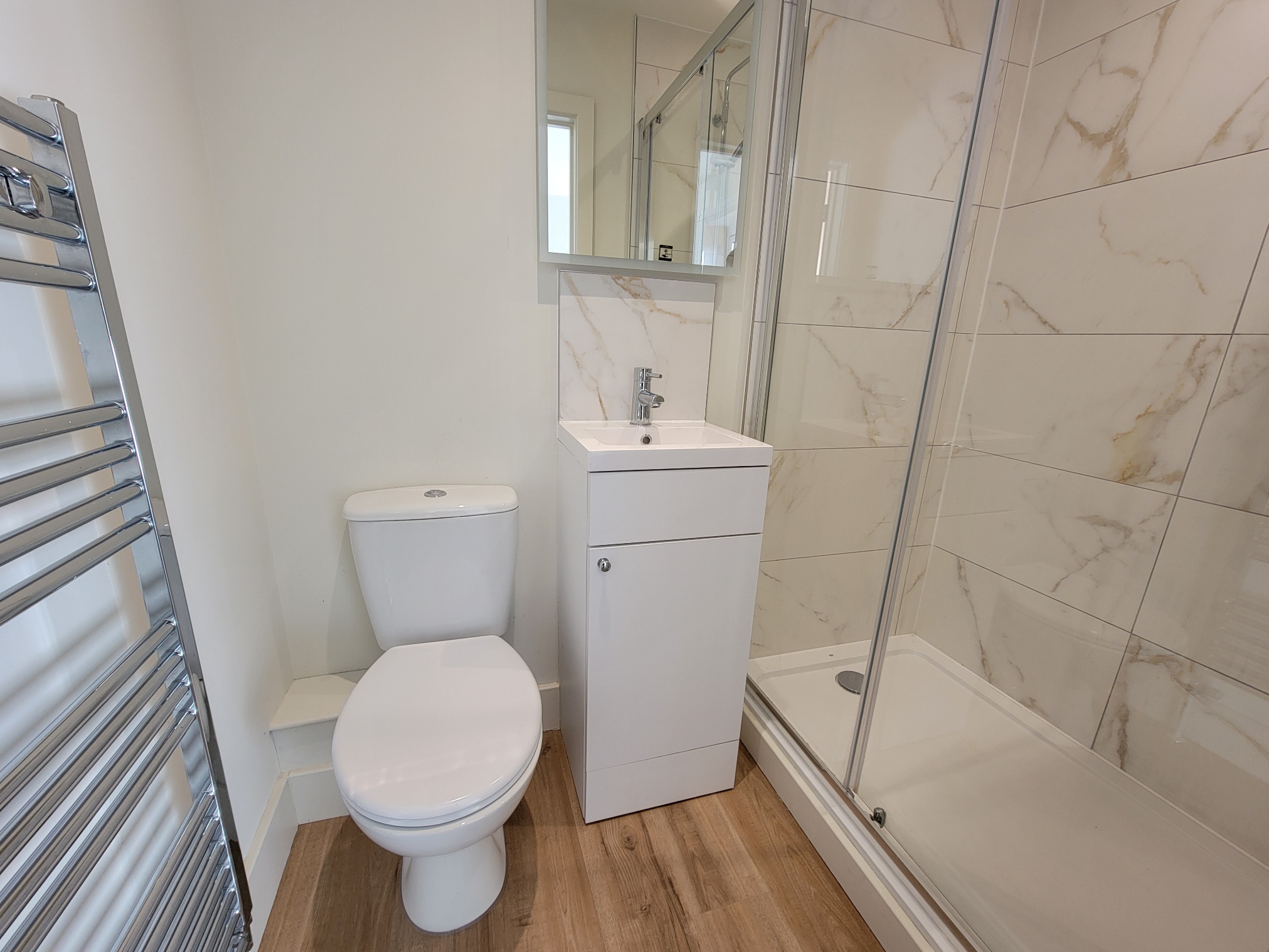 Contemporary suite comprises low level wc, double shower enclosure with sliding glazed screen and attractive marble effect tiles and vanity unit with inset wash hand basin, mono mixer tap and storage cupboard below, generous chrome towel radiator, inset spotlights, extractor fan, illuminated mirror, Karndean style wood effect flooring.
