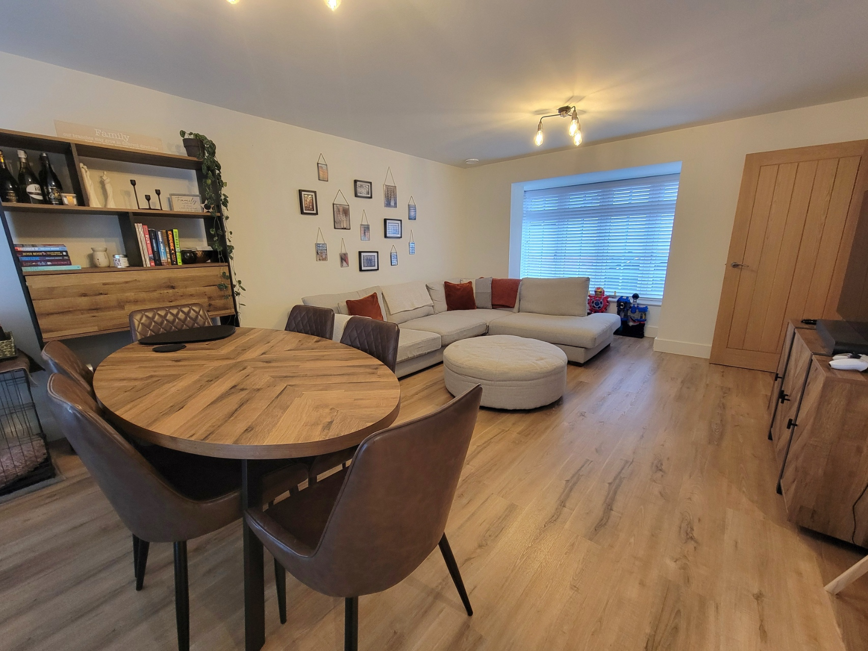 7' 4" x 5' 2" (2.24m x 1.57m) Suite comprises low level wc and vanity unit with inset wash hand basin, mono mixer tap, and storage cupboard below, wood effect flooring, plumbing and space for washing machine, sitting/dining room: