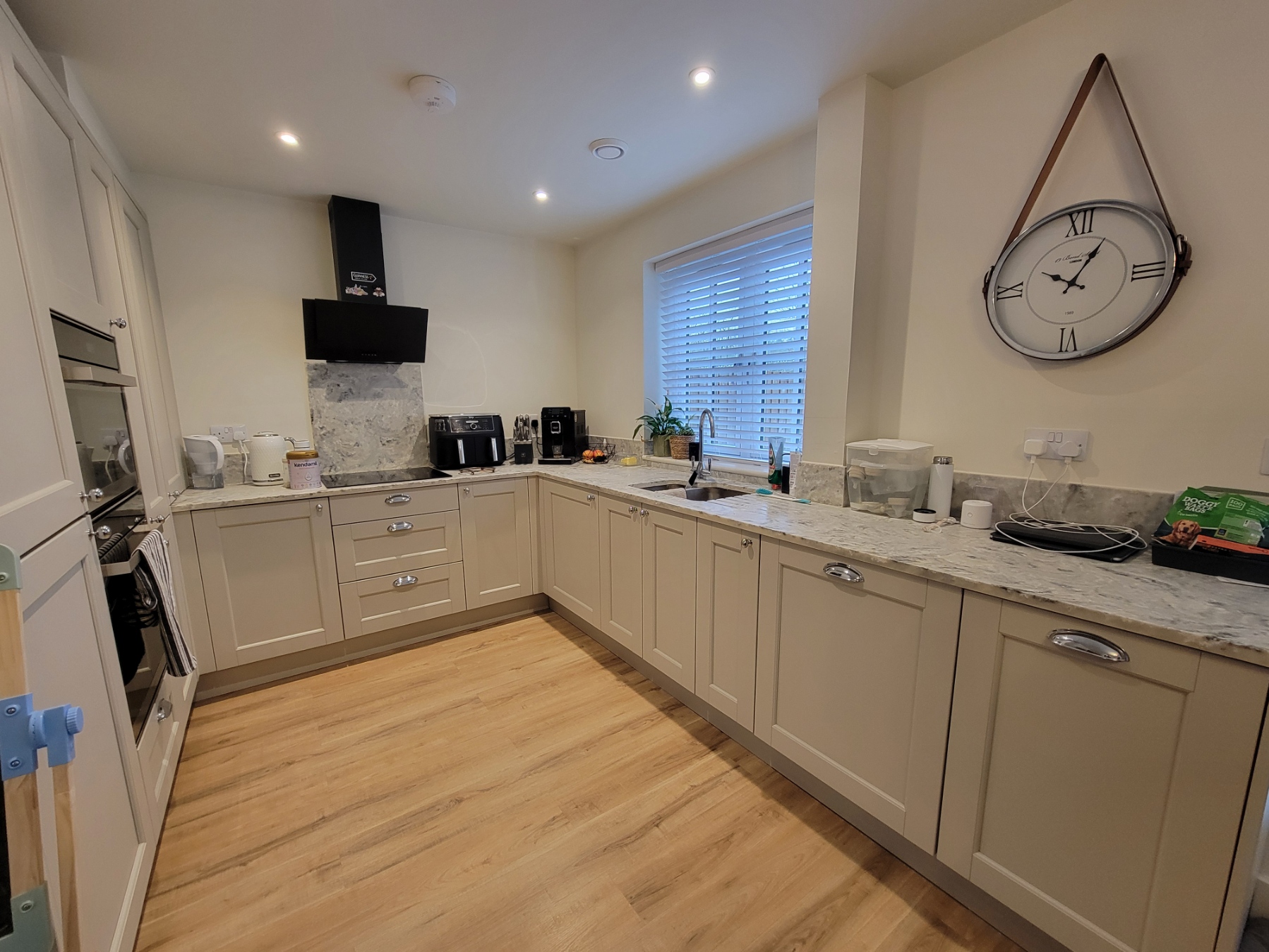 11' 0" x 9' 3" (3.35m x 2.82m) Open to the sitting and dining room. Fitted with a generous range of base and wall mounted units having shaker style panelled doors and drawer fronts, wide pan drawers, fitted white quartz worktops inset with one and a half bowl stainless steel sink unit with mixer tap, integrated fridge/freezer and dishwasher, built-in eye level stainless steel and glass fan assisted oven, second microwave and oven, inset black glass ceramic hob, quartz splashback, contemporary style black glass extractor hood, smoke alarm, inset spotlights, PVC double glazed window overlooking the rear garden.