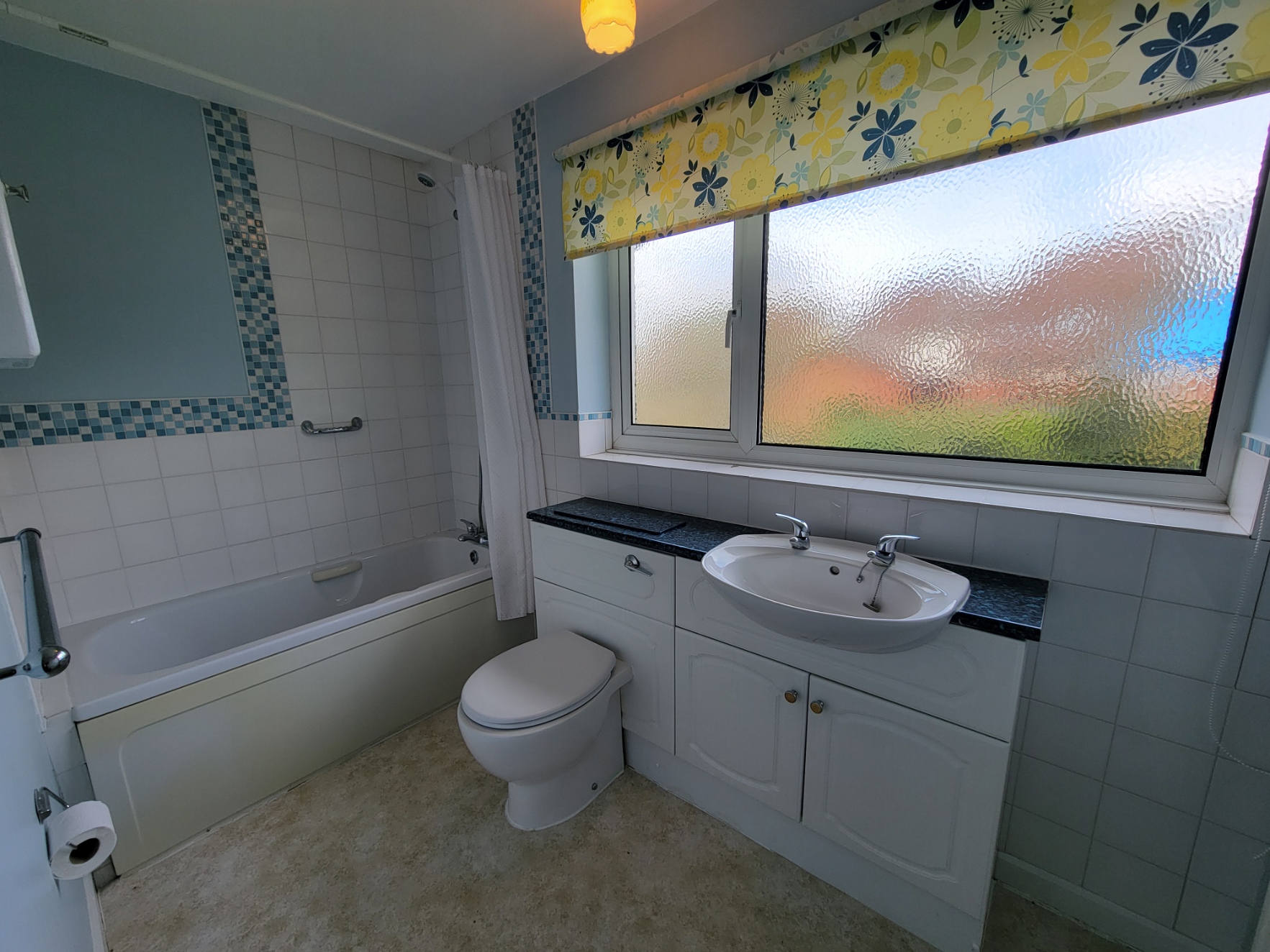 9' 5 " x 5 ' 4 " (2.87m x 1.63m) Plus 2'4" door recess. Modern white suite comprises panel bath with shower mixer tap, low level wc with concealed cistern and wash hand basin with vanity storage cupboards below, radiator, PVC double glazed window to the rear aspect.