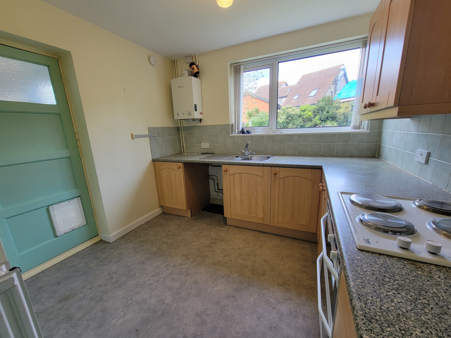 10' 7" x 9' 4 " (3.23m x 2.84m) Fitted with a good range of base and wall mounted units having light oak style panelled doors and drawer fronts, fitted worktops inset with stainless steel singe bowl sink unit with mixer tap, built-in electric oven and grill, four ring hob above, plumbing for washing machine, radiator, modern wall mounted gas fired Worcester boiler, separate built-in shelved larder cupboard, generous PVC double glazed window overlooking the rear garden.