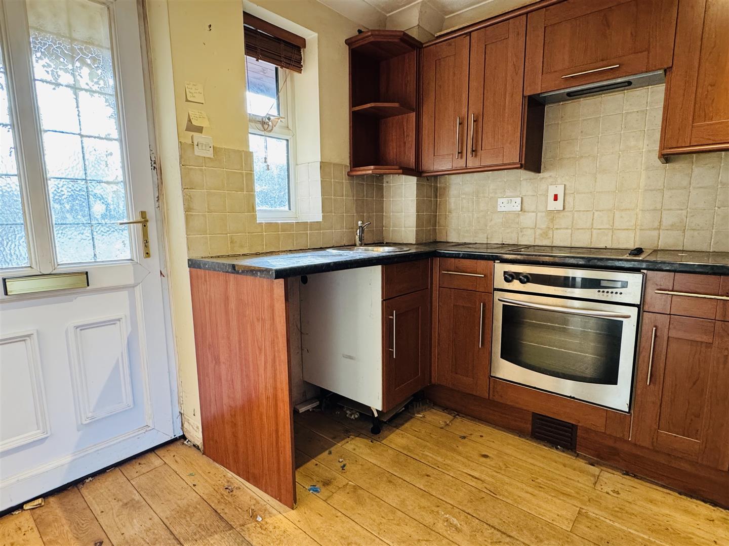 Double glazed window to front, wall and base units, drawers, worktops, gas hob and electric oven (not tested) large under stairs cupboard, through to