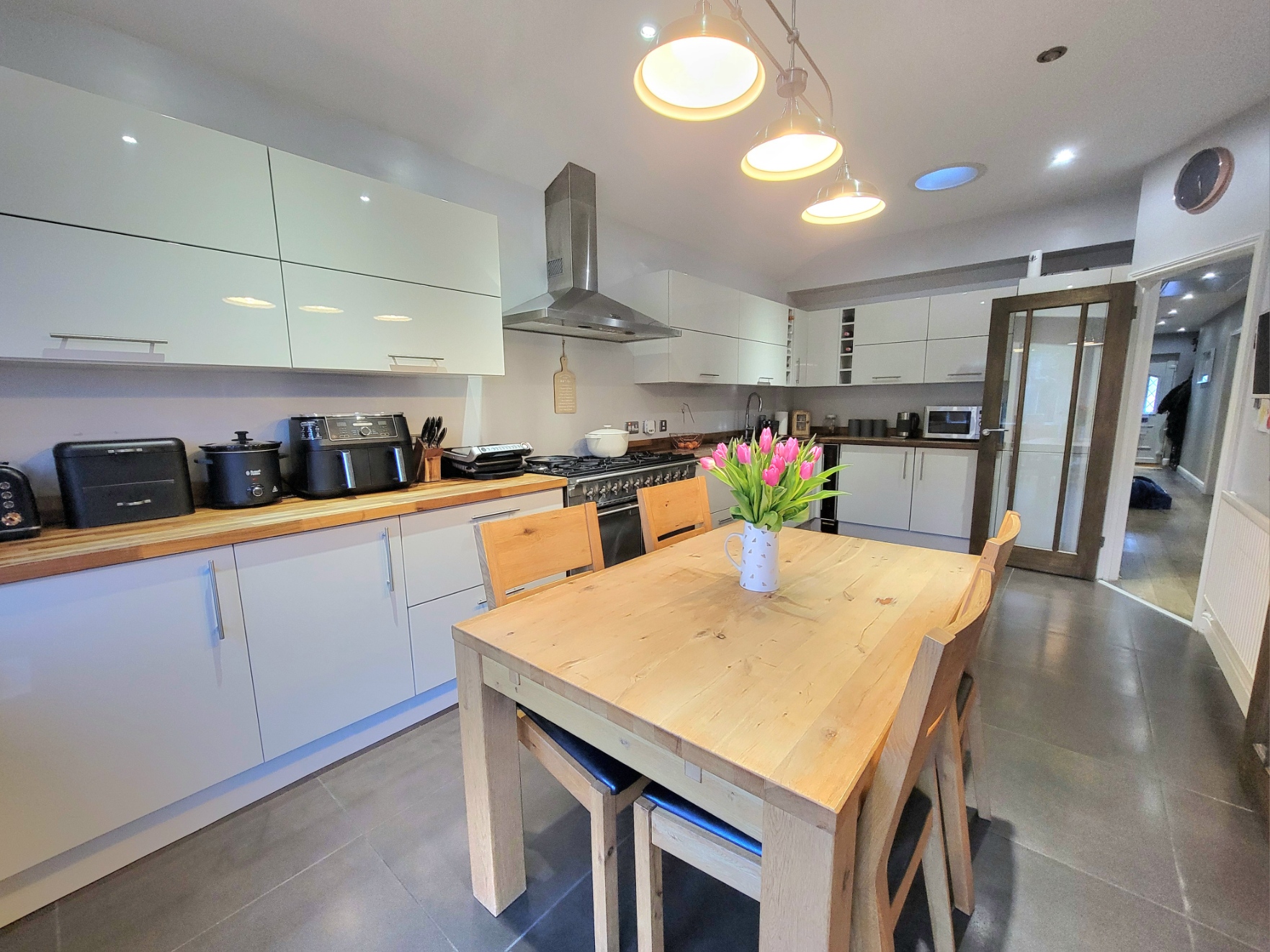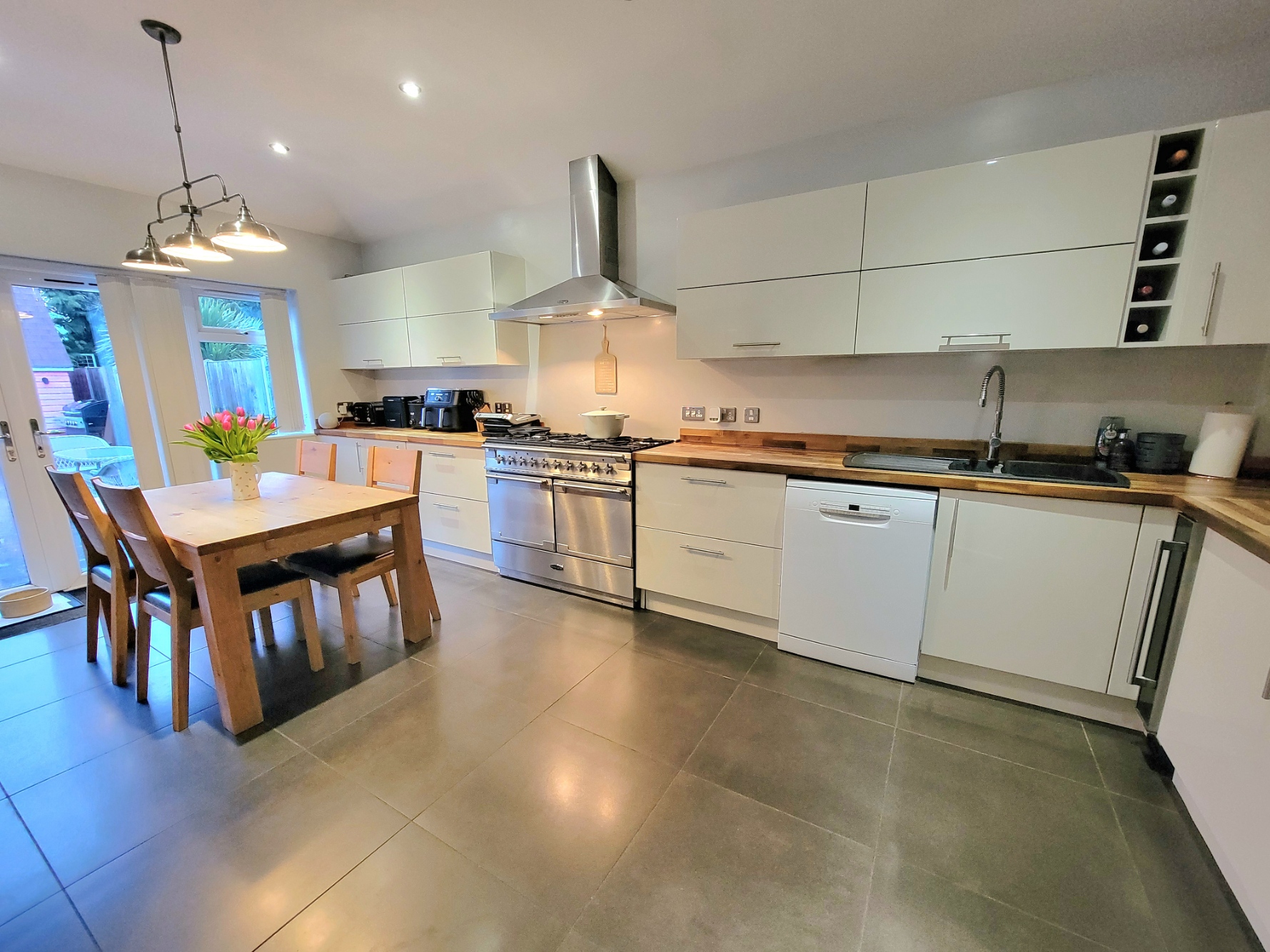 19' 5 " x 10' 3 " (5.92m x 3.12m) Kitchen area fitted with an extensive range of contemporary styled base and wall mounted units having high gloss doors and drawer fronts wide pan drawers, thick solid wood worktops inset one and a half bowl sink unit with mixer tap, plumbing for dishwasher, integrated washing machine, space for range cooker with stainless steel extractor connected over, integrated low level fridge and freezer, inset spotlights, large square glazed floor tiles, glazed double doors lead to the sitting room, PVC double glazed window and wide French doors opening to the garden.