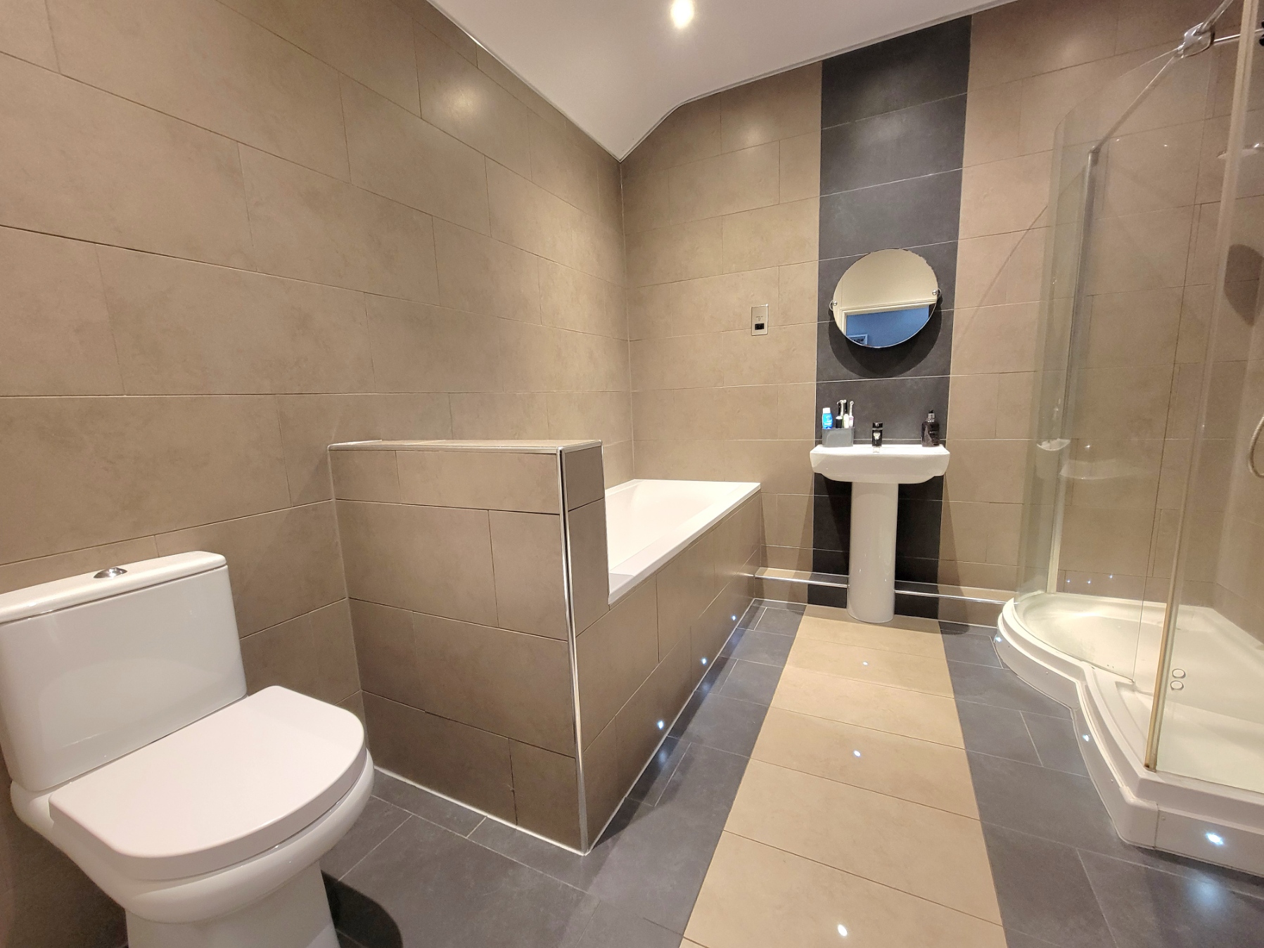 9' 9" x 8' 9" (2.97m x 2.67m) High quality suite comprises low level wc, pedestal wash hand basin, deep inset bath with mixer tap, and independent curved, glazed shower enclosure with fixed glazed screen, extensive wall tiling, floor tiling with underfloor heating, inset spotlights.