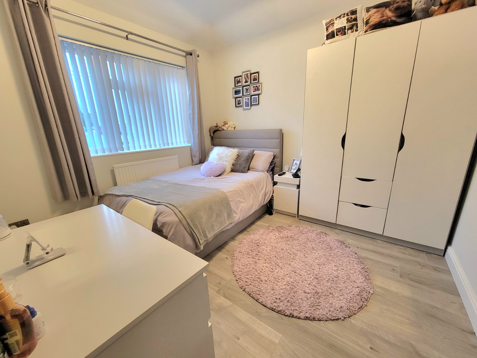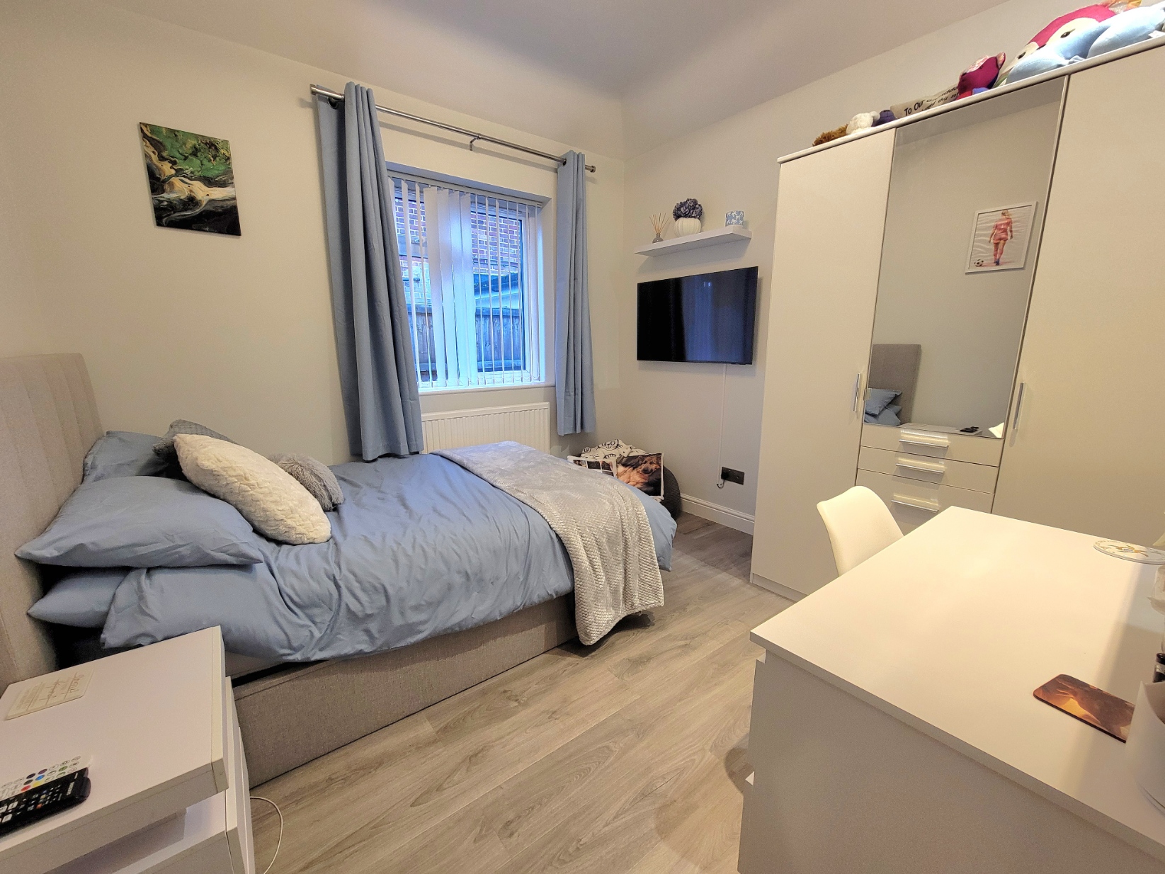 10' 9" x 10' 9" (3.28m x 3.28m) With 9' high ceiling. Radiator, light wood effect flooring, solid wood door, PVC double glazed window to the front aspect.