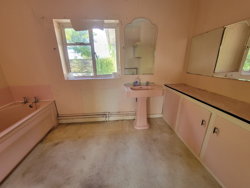 FAMILY BATHROOM: 10' 9" x 7' 9" (3.28m x 2.36m) coloured suite comprises heavy cast iron bath, pedestal wash hand basin, radiator, chrome towel rail, built-in low level storage cupboard, window to the rear aspect.